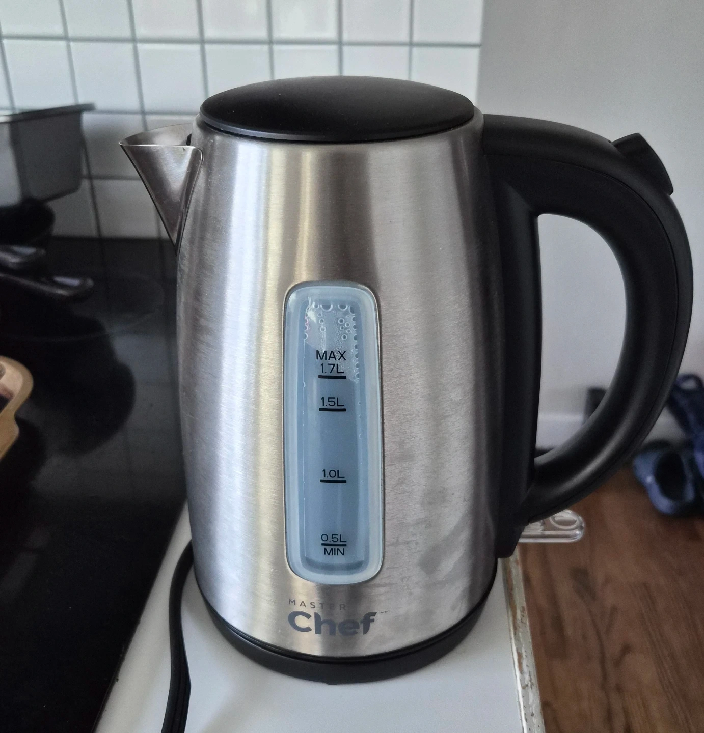This is a Cordless Master Chef stainless steel electric kettle with a 1.7L capacity. It features a water level indicator with markings for 0.5L (MIN) to 1.7L (MAX). The kettle is made of stainless steel and has a black handle and lid.