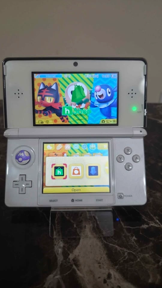 Pristine condition 3DS console modded / jailbroken with hShop app (can download and install any game directly on the console for free), charger, metal stylus, 32gb high speed SD card with top game series & apps pre-installed.