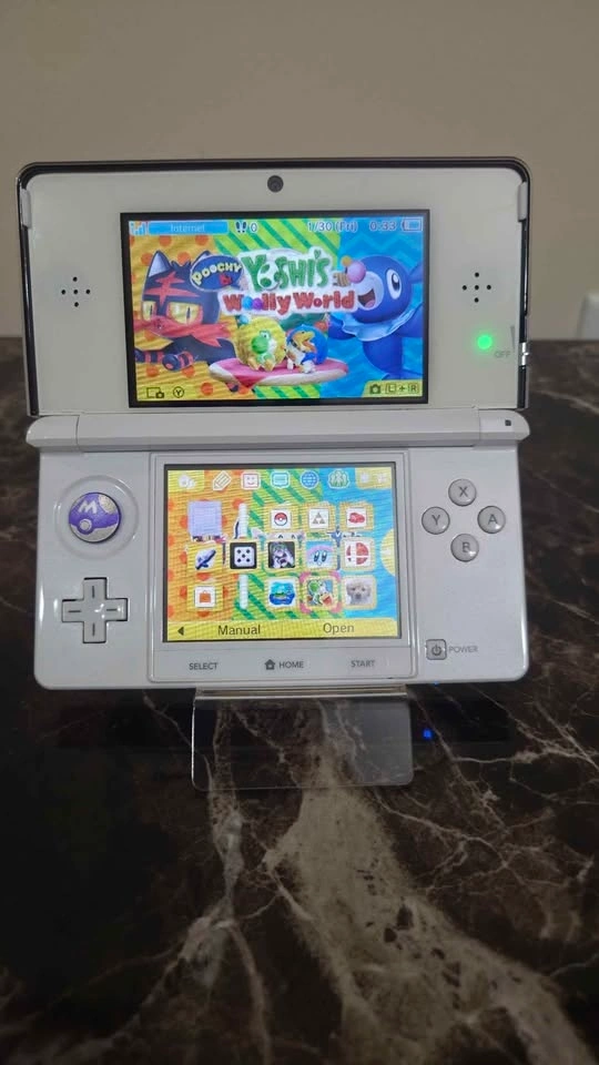 This console has had a brand new durable metal c-pad joystick installed (Master Ball engraving, Purple). It also had the standard black plastic top screen lens replaced with a white glass one, so the top screen is 100% free of wear and tear.