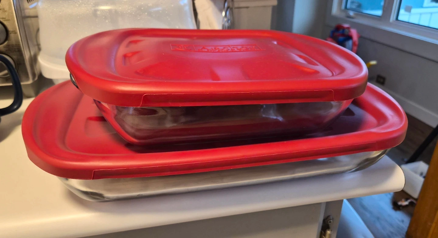 Two Anchor Hocking glass baking dishes with red lids. One is rectangular and appears to be a casserole dish. Both are made of glass with red plastic lids. They're dishwasher and microwave safe.