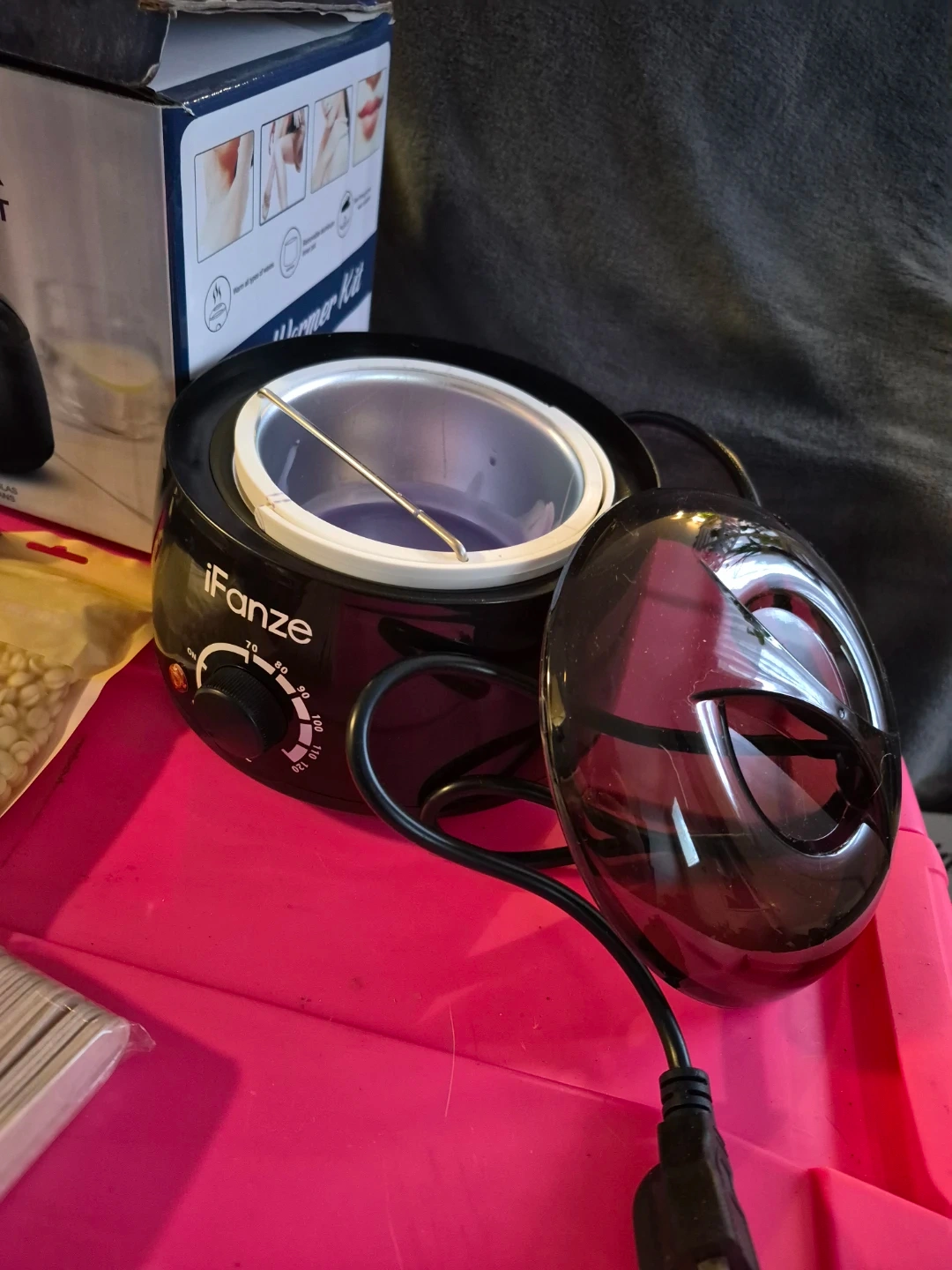 This iFanze professional wax hair removal kit includes a wax warmer, multiple bags of hard wax beans in various colours, and 30 wooden spatulas. It's designed for efficient hair removal at home or in a salon. The kit provides everything needed for a complete waxing session.