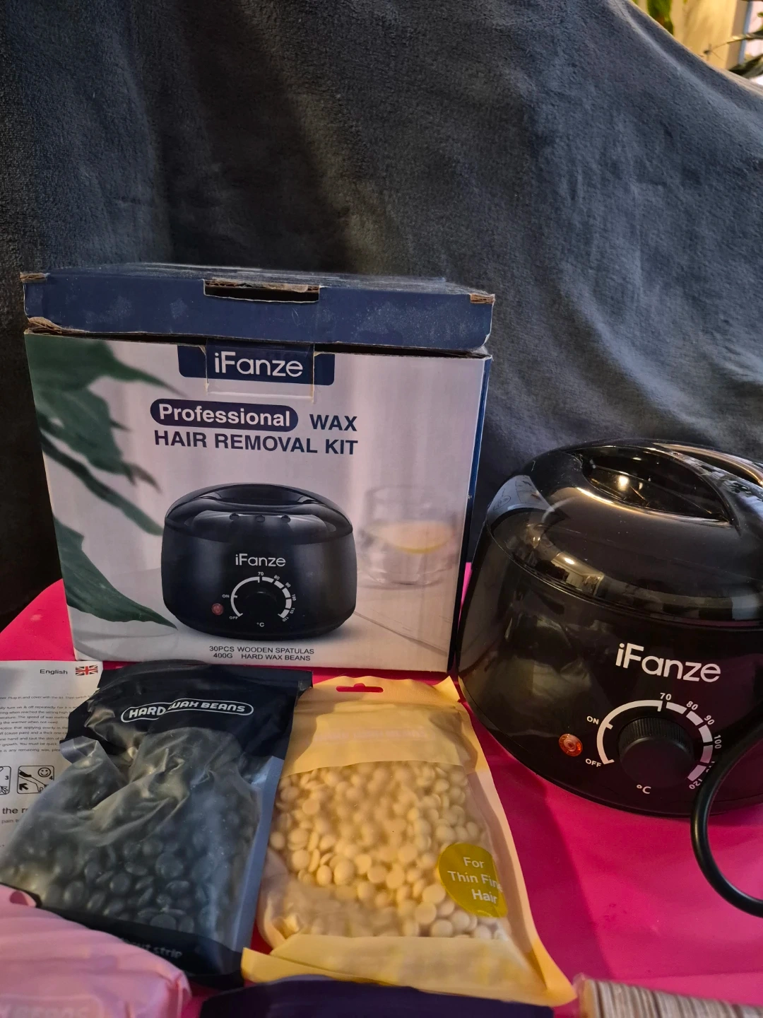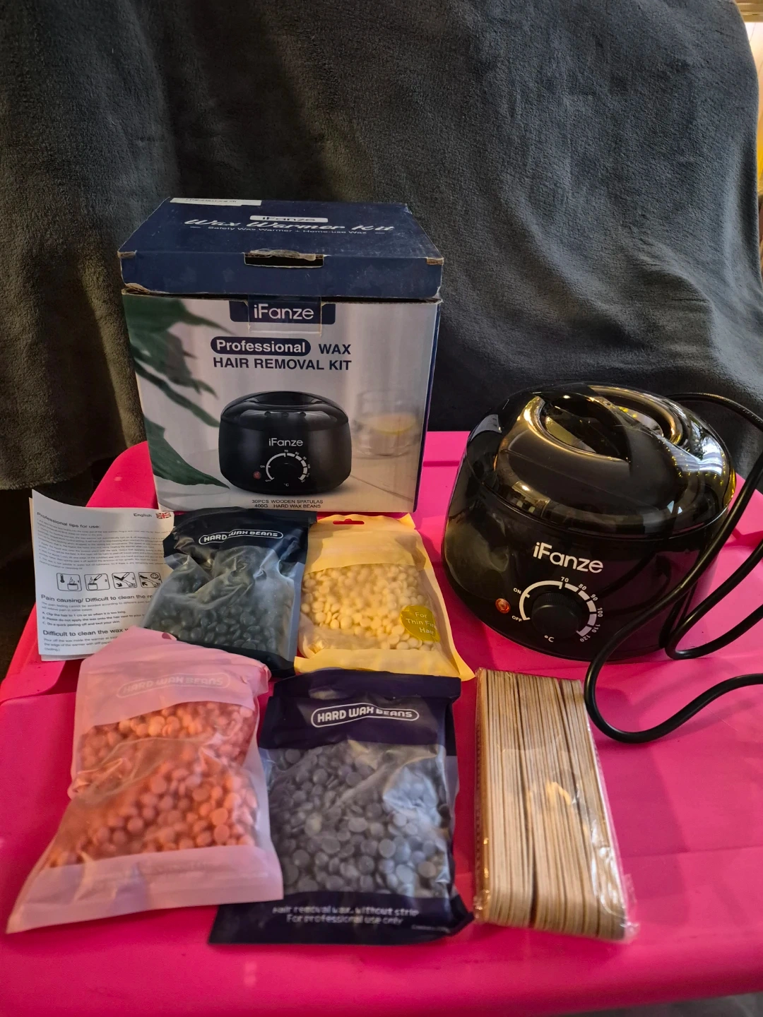 This iFanze professional wax hair removal kit includes a wax warmer, multiple bags of hard wax beans in various colours, and 30 wooden spatulas. It's designed for efficient hair removal at home or in a salon. The kit provides everything needed for a complete waxing session.