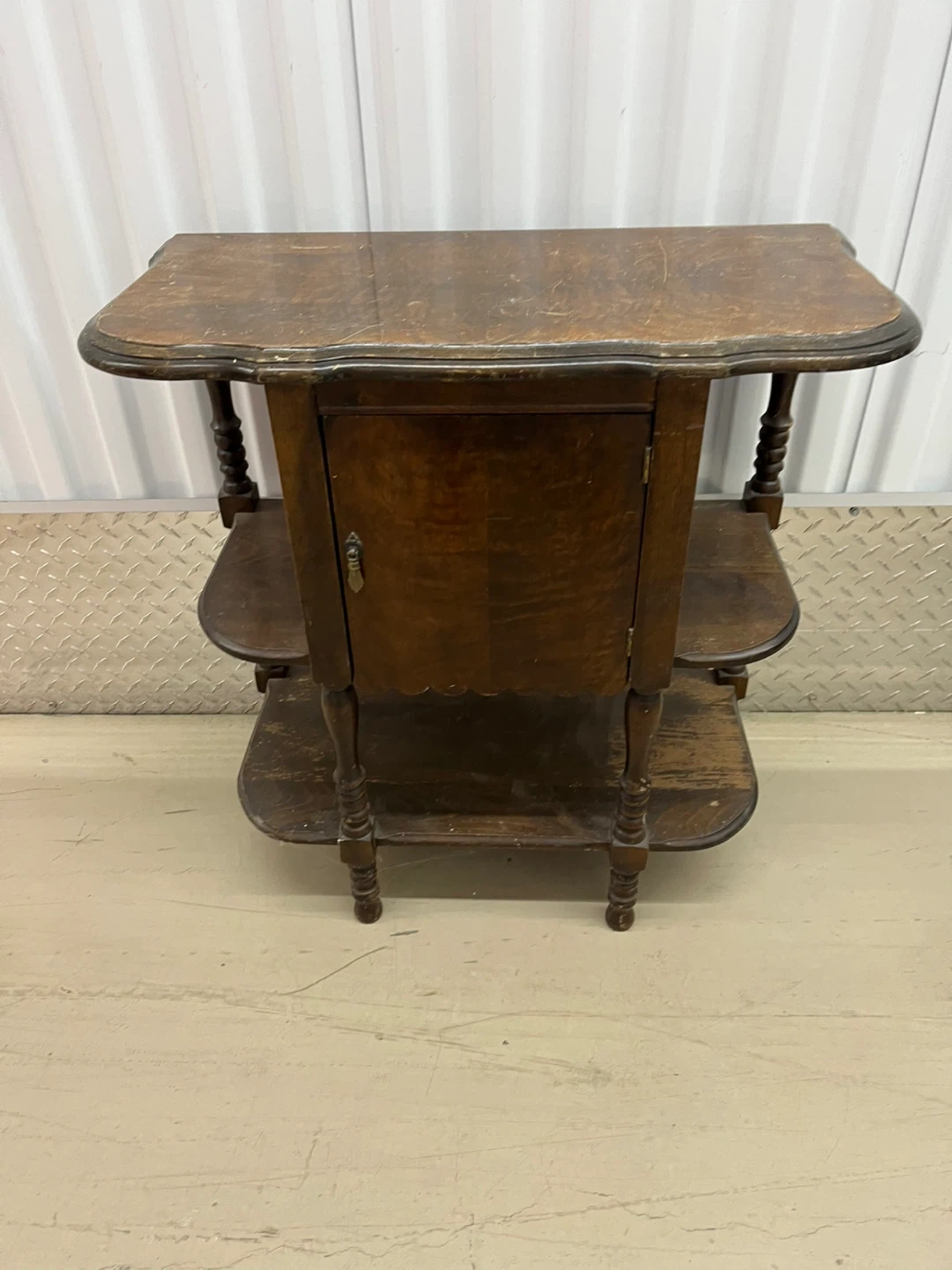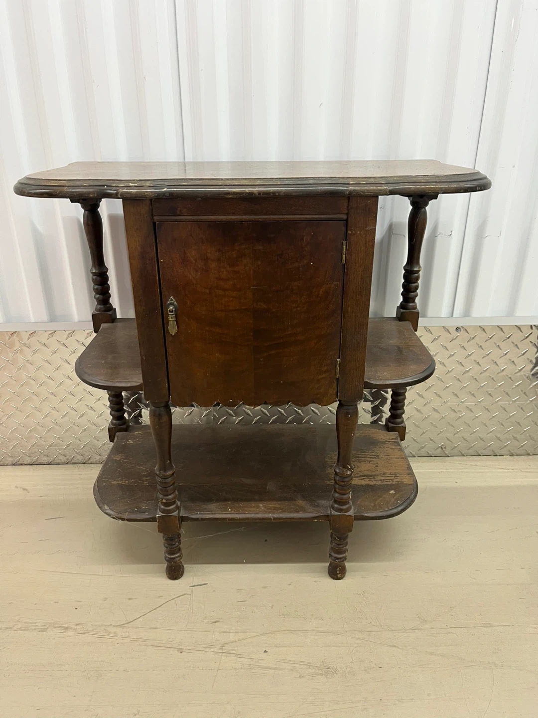 This beautiful vintage side table is made of dark wood. It features a central cabinet with a small door and two open shelves below. Its classic design includes turned legs and a scalloped edge on the shelves. It's perfect for adding a touch of vintage charm to any room.