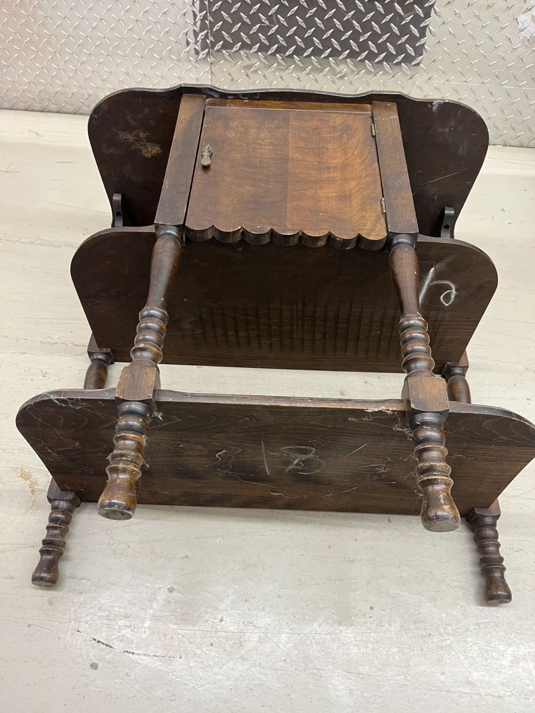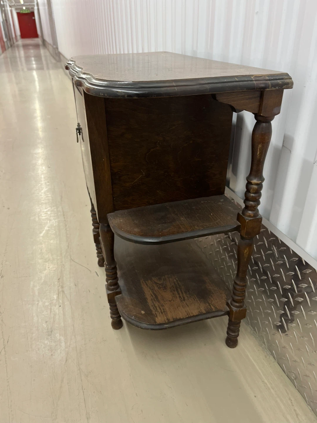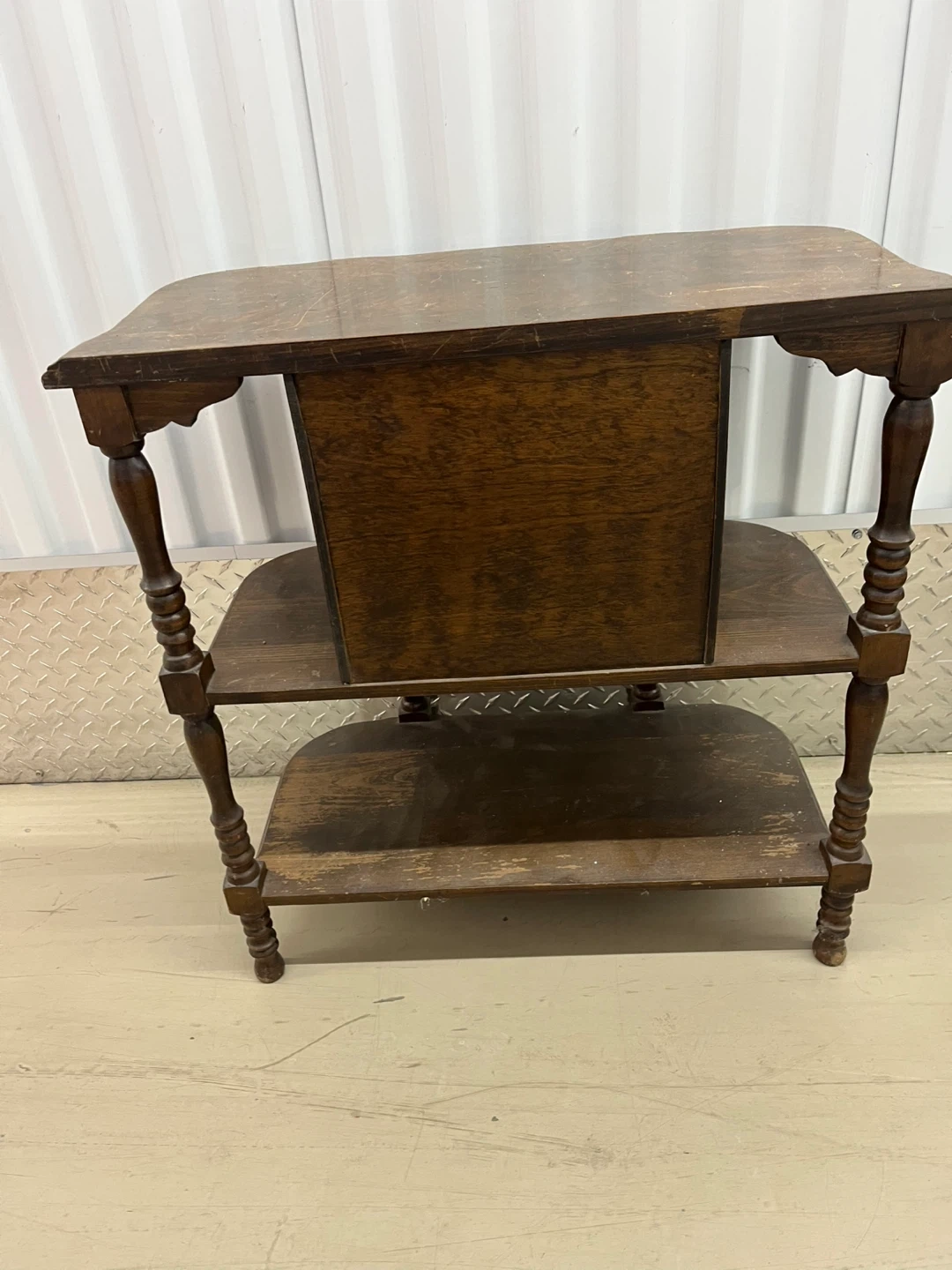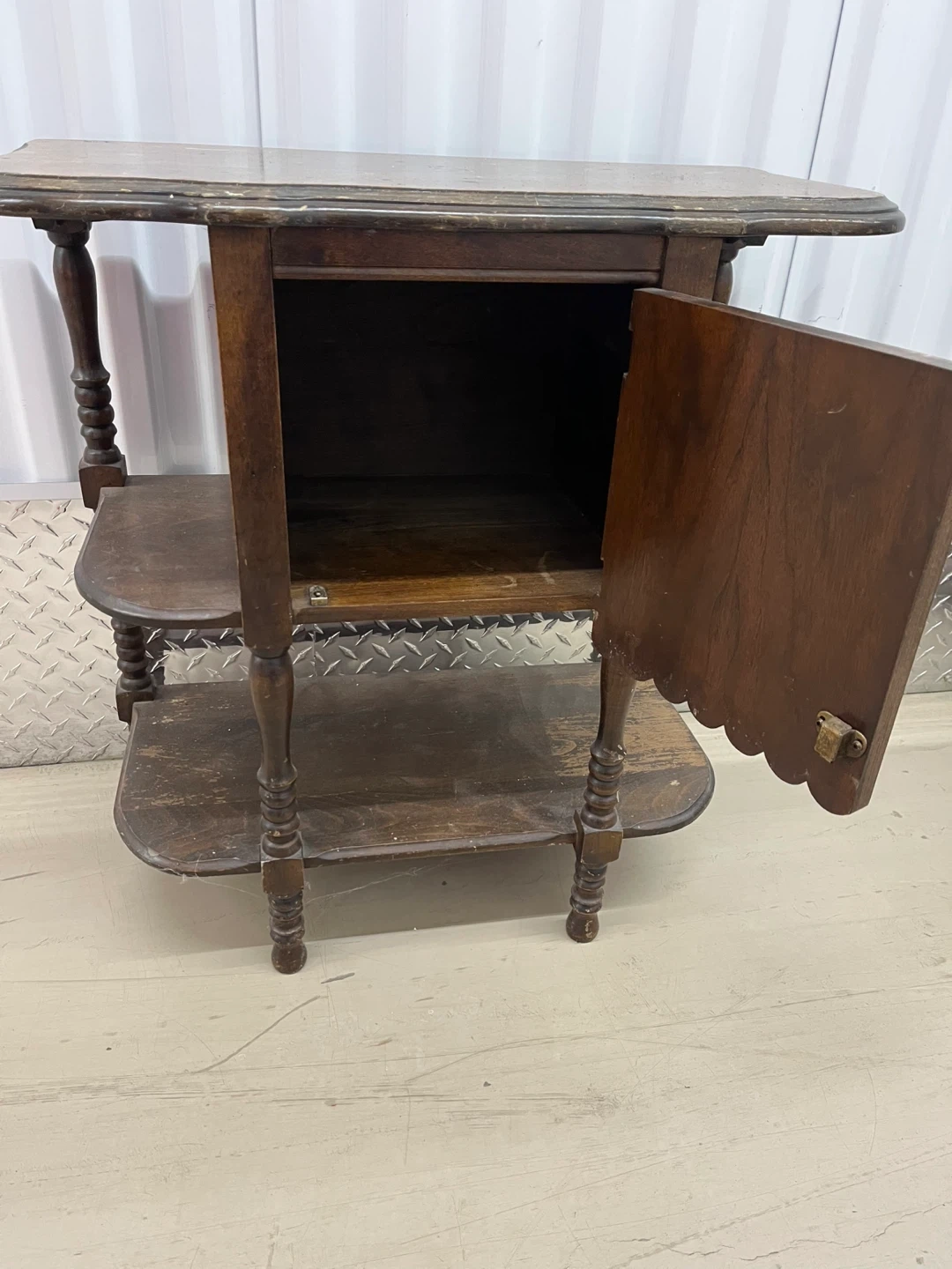 This beautiful vintage side table is made of dark wood. It features a central cabinet with a small door and two open shelves below. Its classic design includes turned legs and a scalloped edge on the shelves. It's perfect for adding a touch of vintage charm to any room.