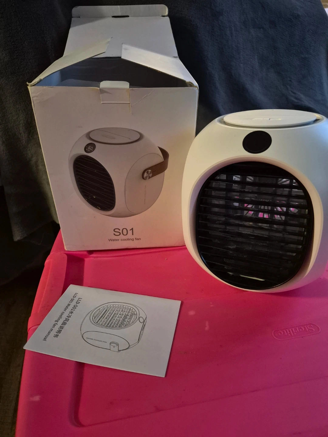 Portable S01 water cooling fan. It's white with a brown leatherette handle. Includes original box and manual. Great for personal cooling!