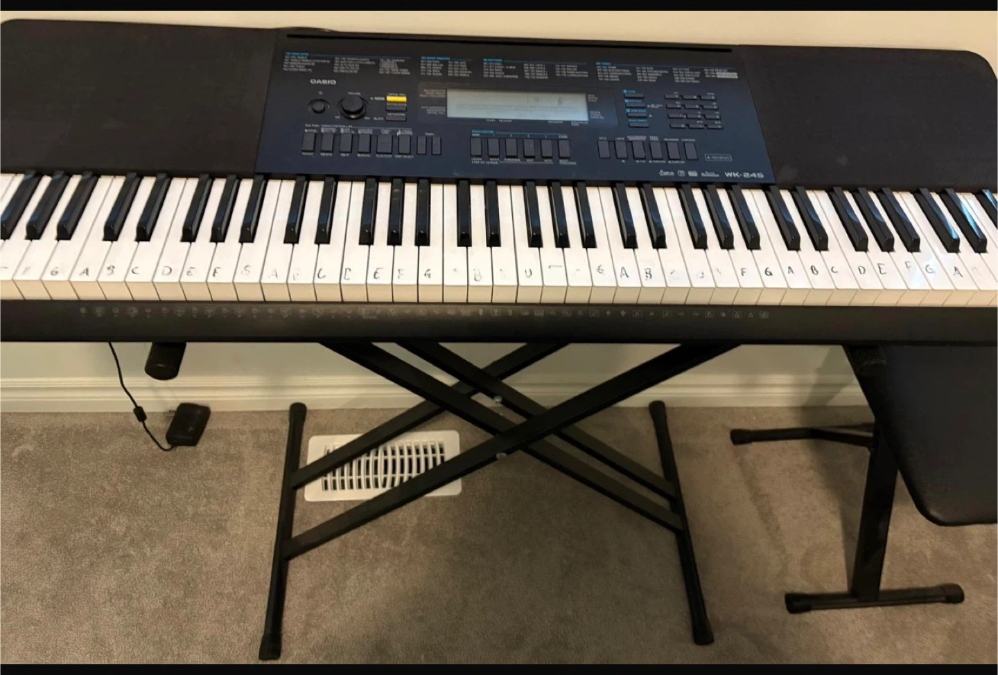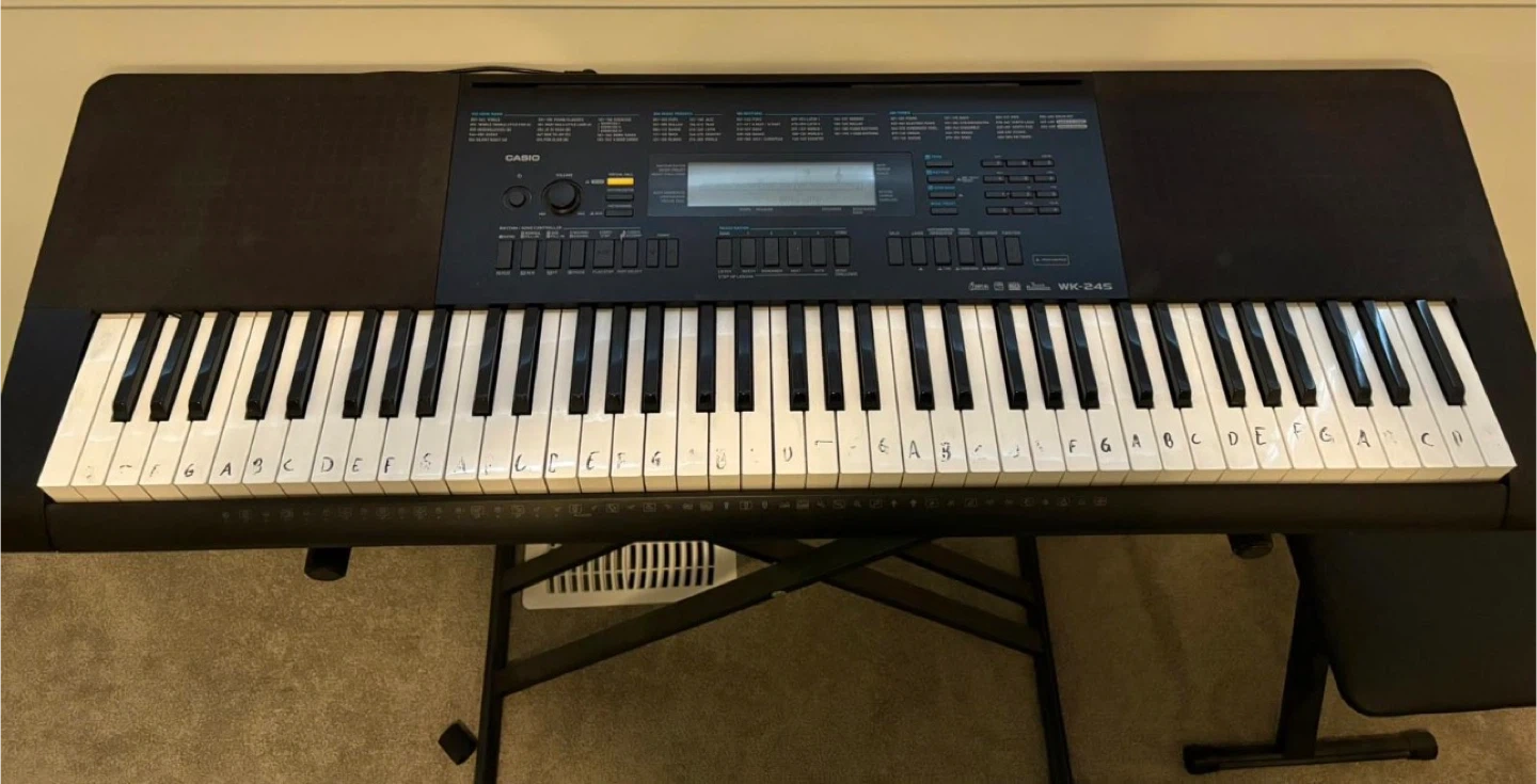 This is a Casio WK-245 keyboard, a great starter instrument for learning to play. It's in good working condition and comes with a sturdy metal stand and a comfortable padded bench. The keys have letter stickers, which can be removed if preferred.