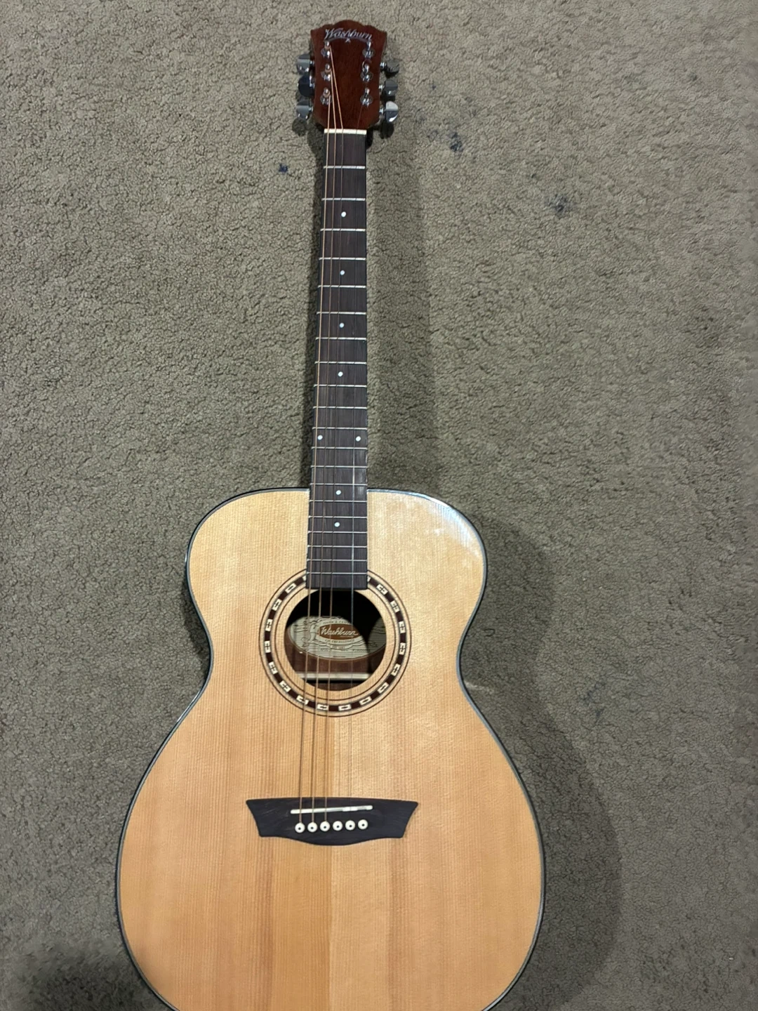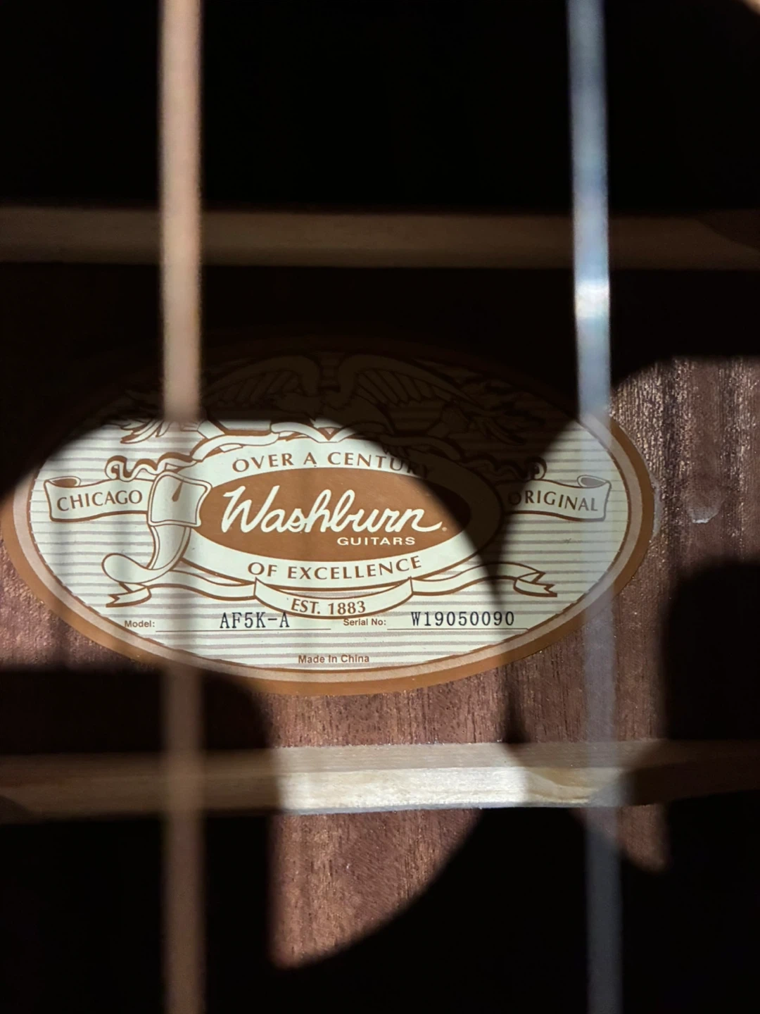 This is a Washburn AP5K-A acoustic guitar. It's made in China. Its serial number is W19050090. This guitar is a great choice for beginners and experienced players alike!
