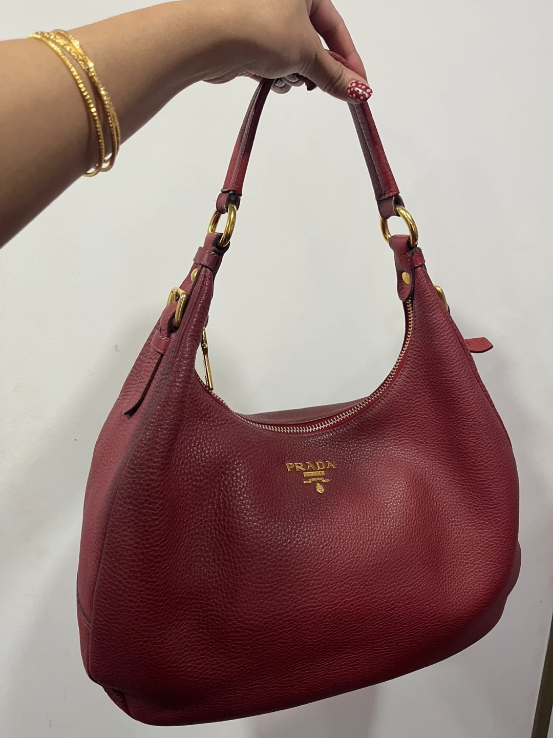 A deep red/burgundy leather shoulder hobo bag by Prada. It features gold-tone hardware and a zippered closure. This bag is made from pebbled leather.