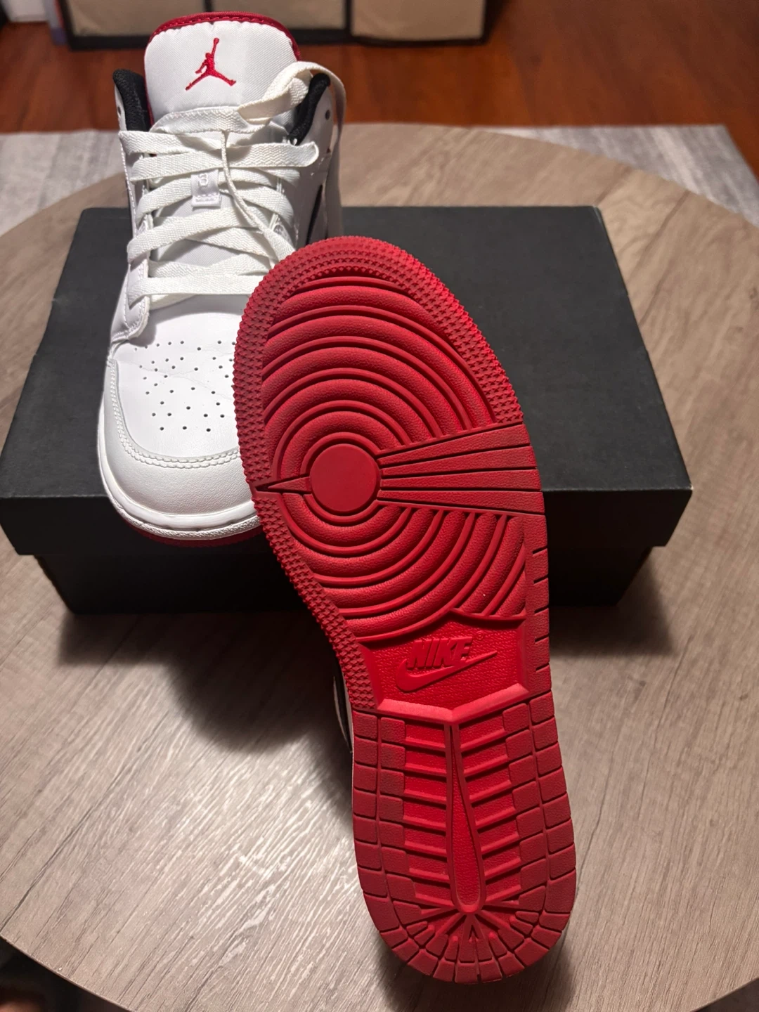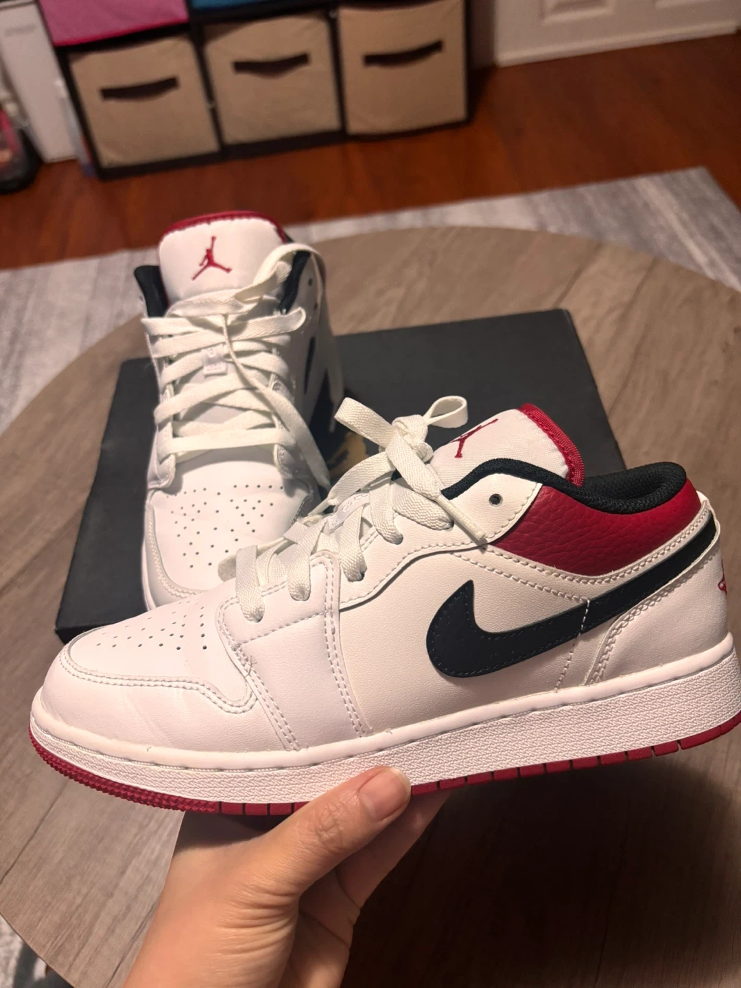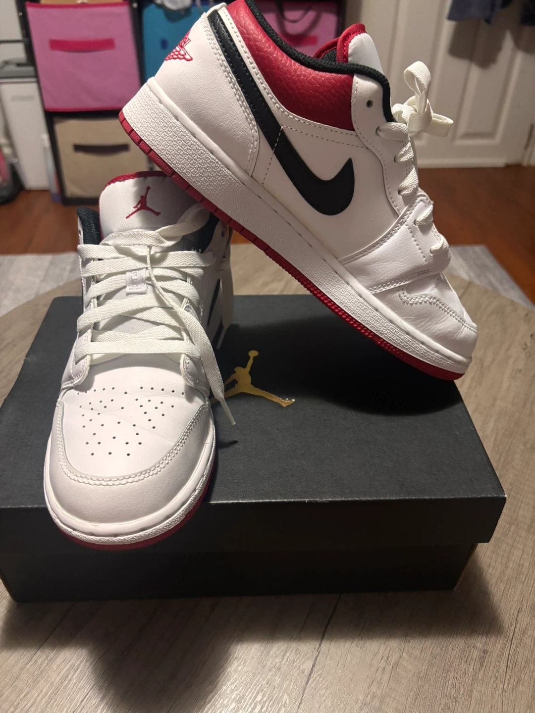 These are a pair of white and red Air Jordan 1 Low SE shoes. They feature a leather upper with a rubber sole. Includes original box.