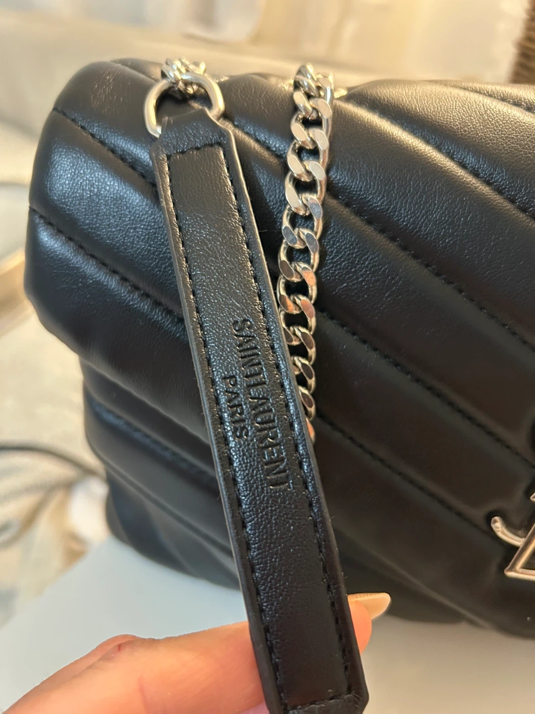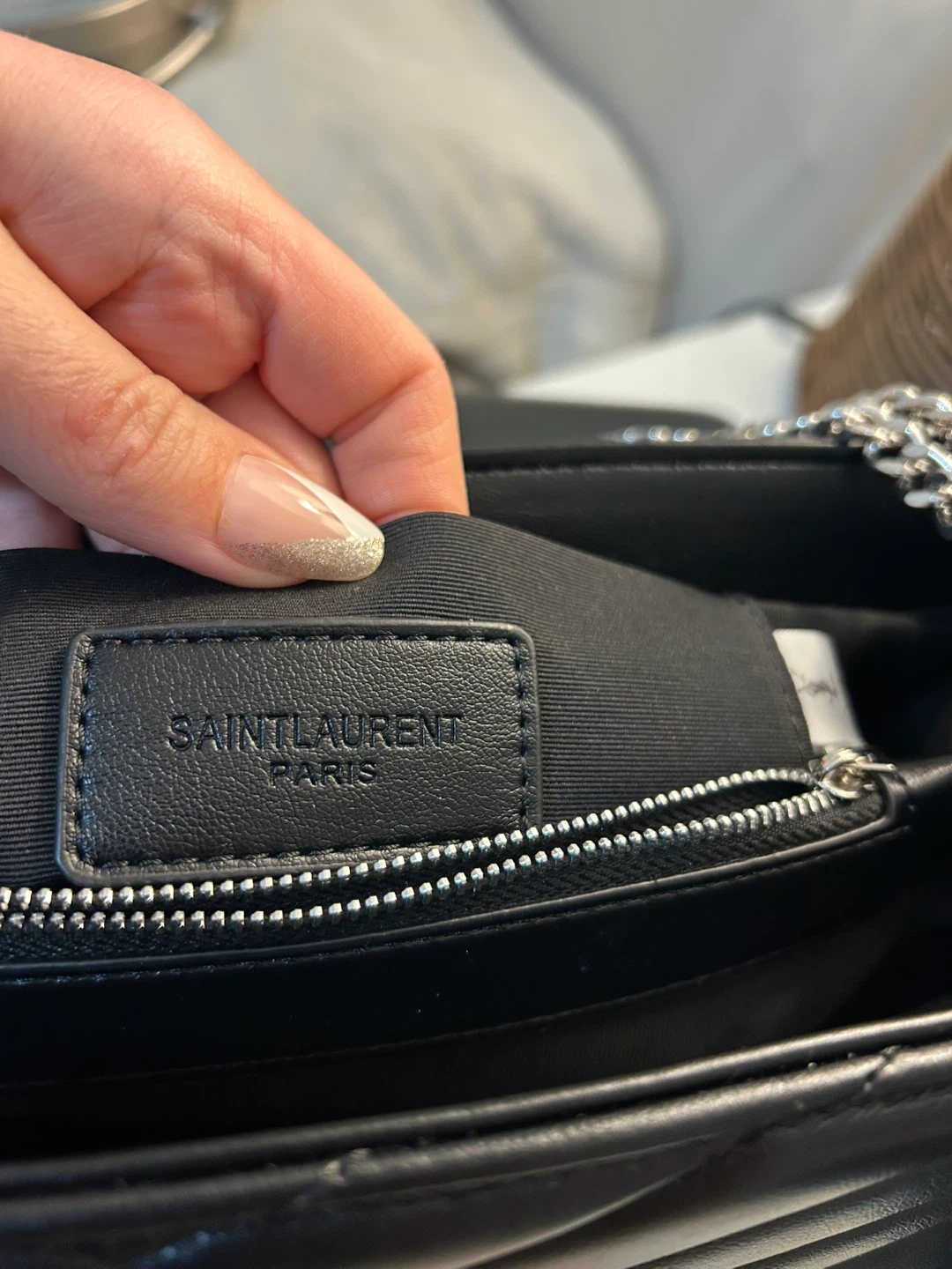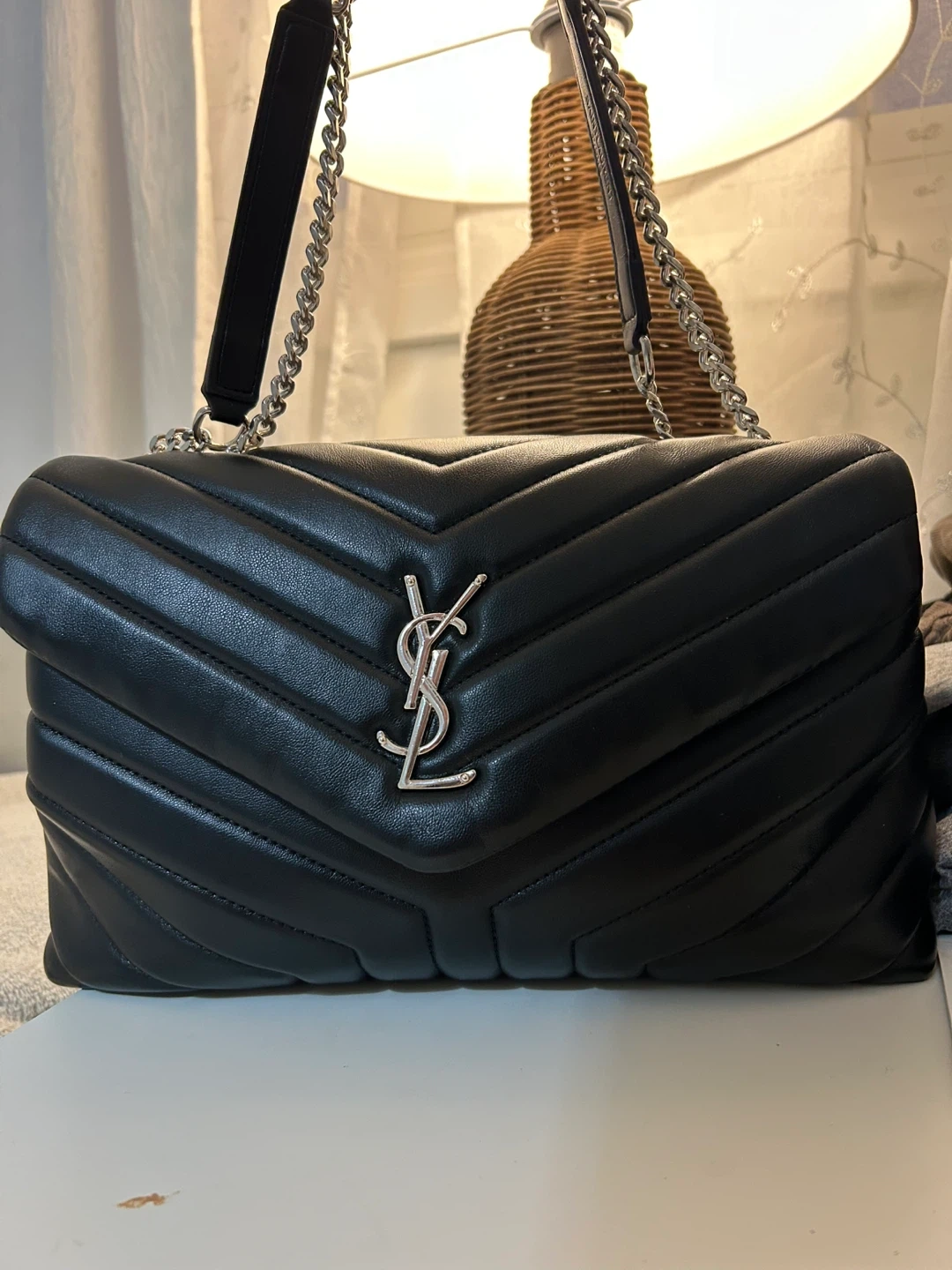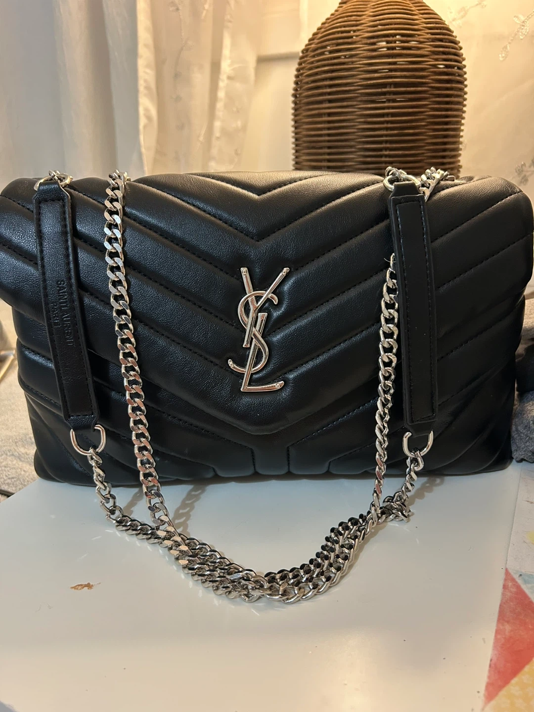 This is a shoulder bag crafted from black quilted leather. It features a silver-tone chain strap and the iconic YSL logo. The interior has a zippered compartment for secure storage.
