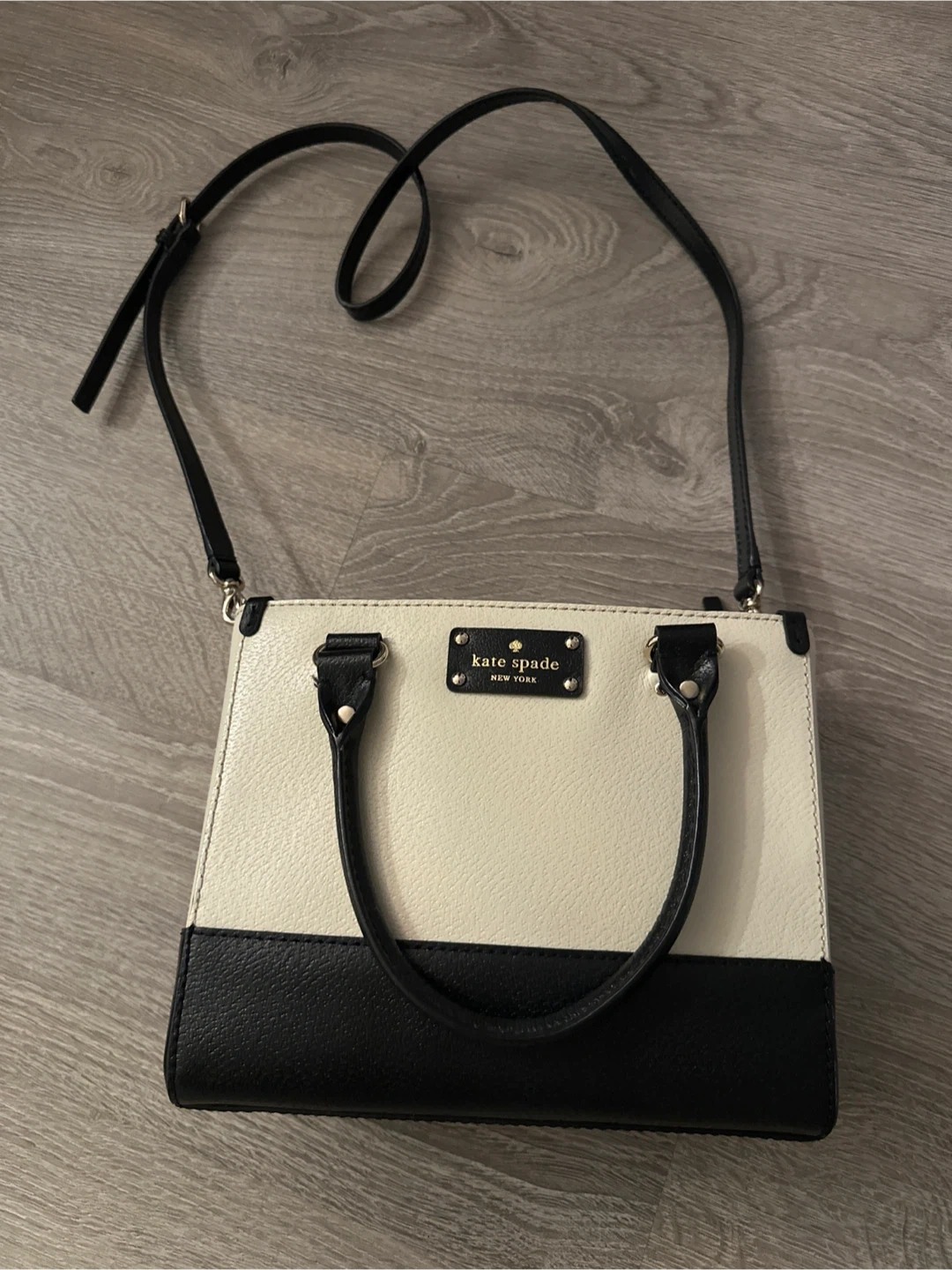 Kate Spade satchel handbag in black and white. It's a stylish accessory for everyday use. This bag features multiple compartments inside for organization. Leather material.