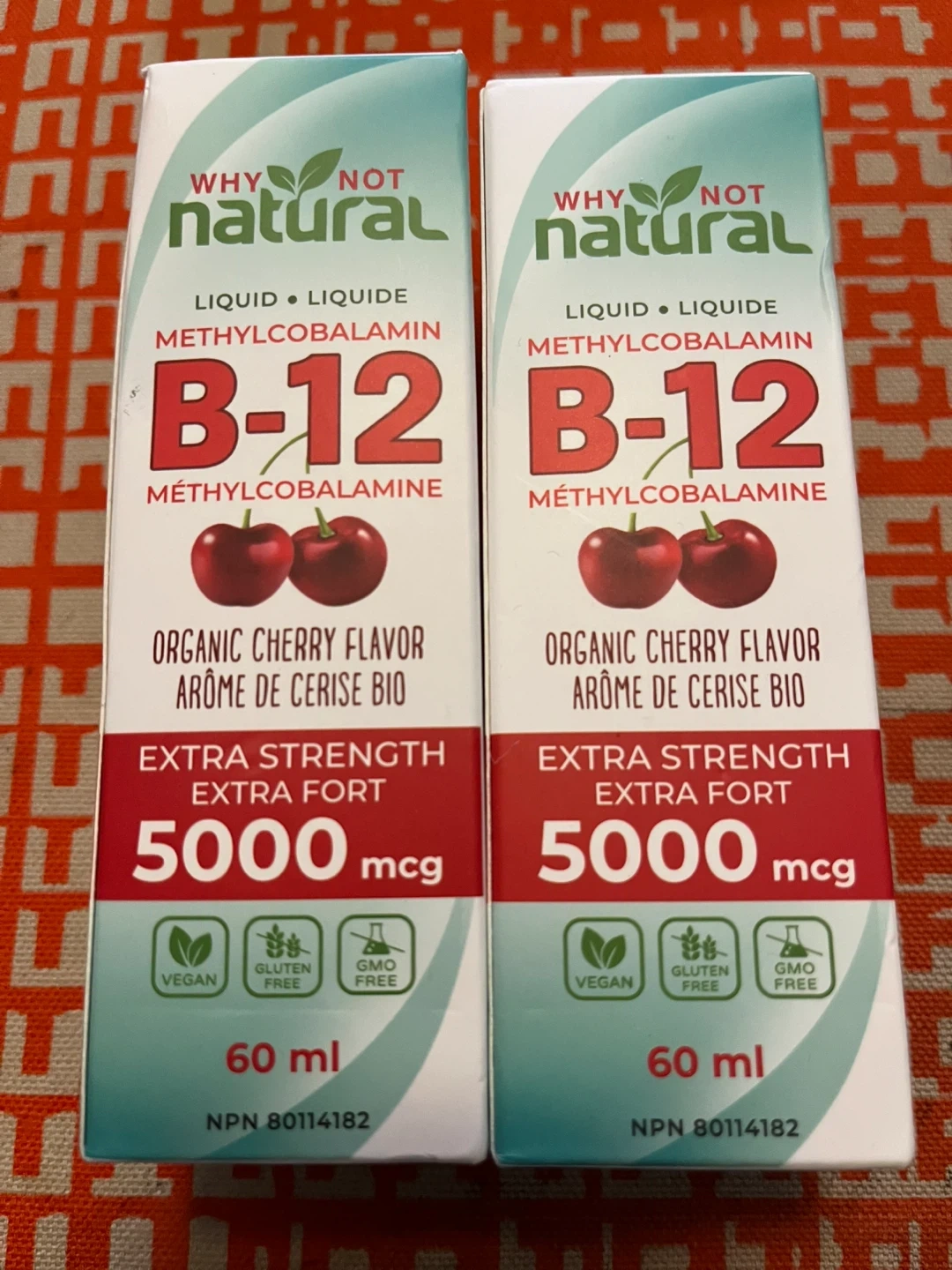 These B-12 Methylcobalamin drops have an organic cherry flavour and are extra strength at 5000 mcg. The bottles are 60 ml each. They're vegan friendly, gluten-free, and GMO-free. This product contains no food colouring, as the methylcobalamin is naturally red. They're great for helping maintain a healthy metabolism and supporting the immune system.