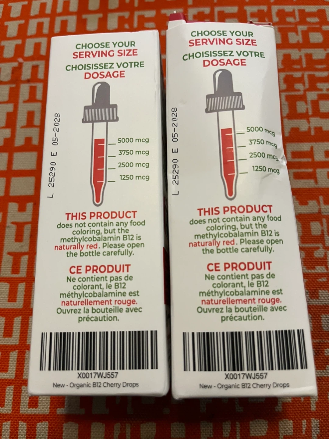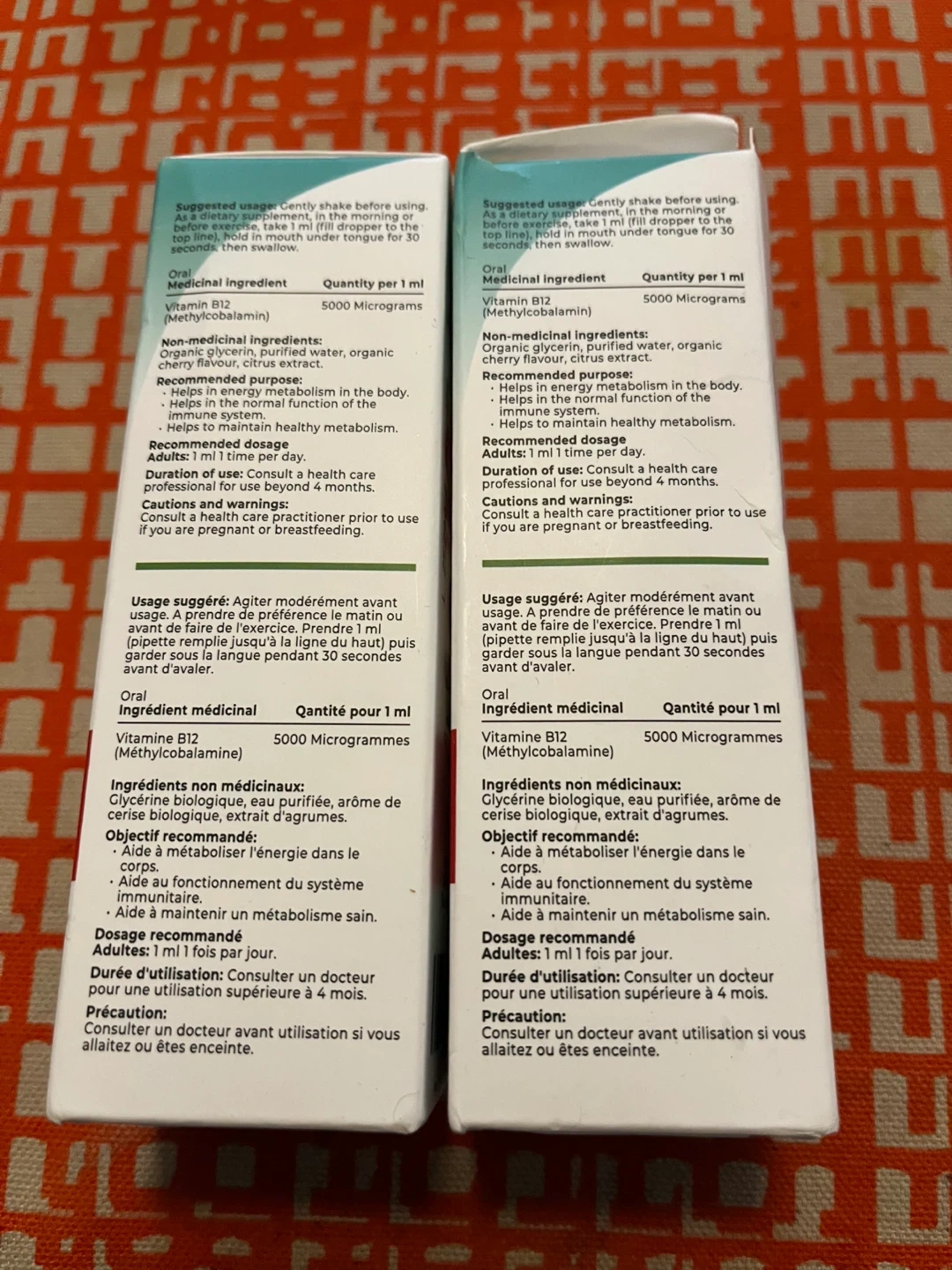 These B-12 Methylcobalamin drops have an organic cherry flavour and are extra strength at 5000 mcg. The bottles are 60 ml each. They're vegan friendly, gluten-free, and GMO-free. This product contains no food colouring, as the methylcobalamin is naturally red. They're great for helping maintain a healthy metabolism and supporting the immune system.