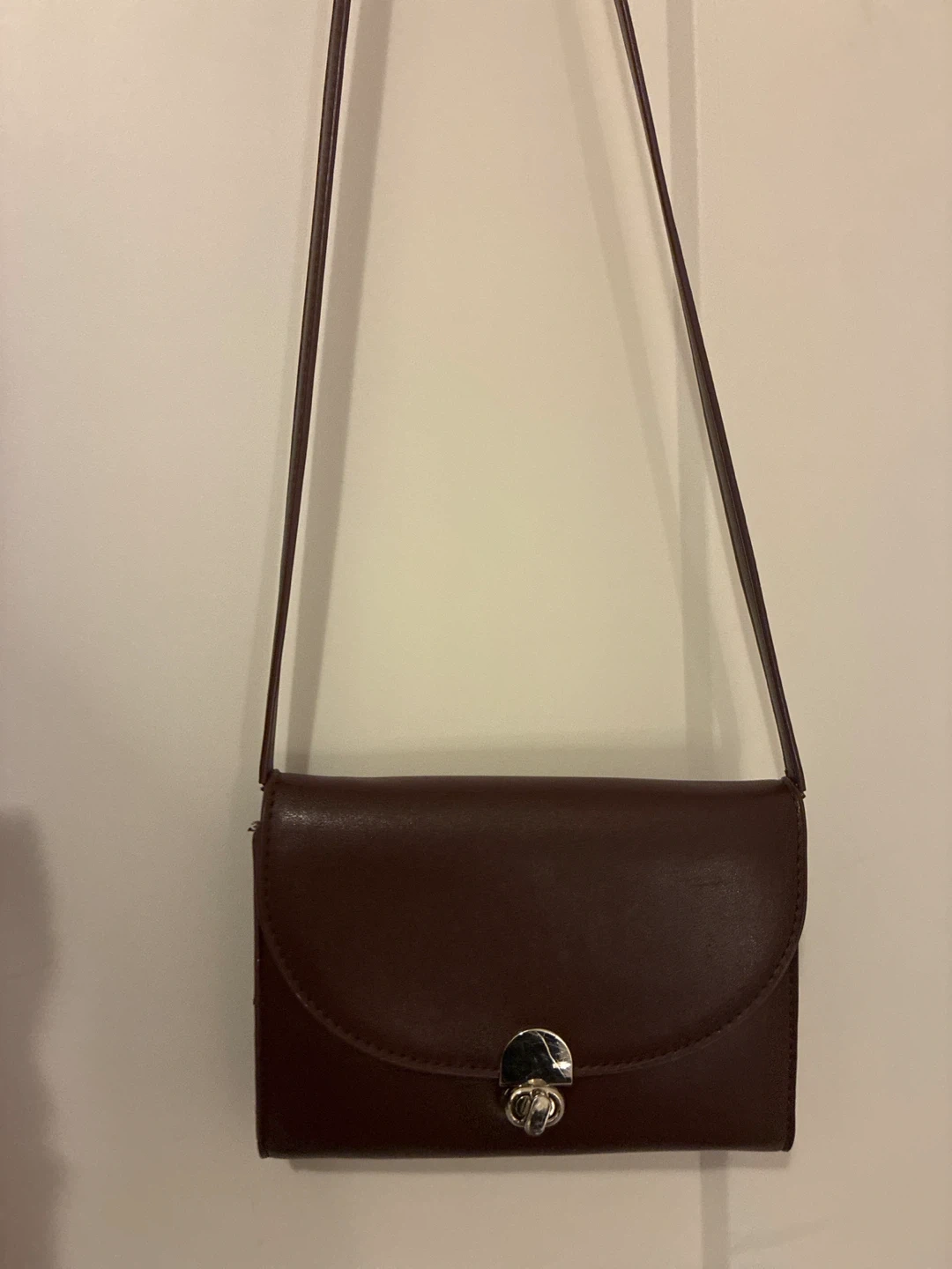 This stylish burgundy crossbody bag is made from faux leather. It features a secure turn-lock closure and an adjustable strap for comfortable wear. It's a versatile accessory for everyday use! Removable strap