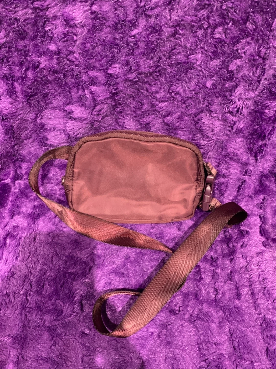 It's a Everywhere Belt Bag in a plum colour. It's made of nylon fabric and features an adjustable strap with a buckle closure. The bag has a zippered main compartment for your essentials.