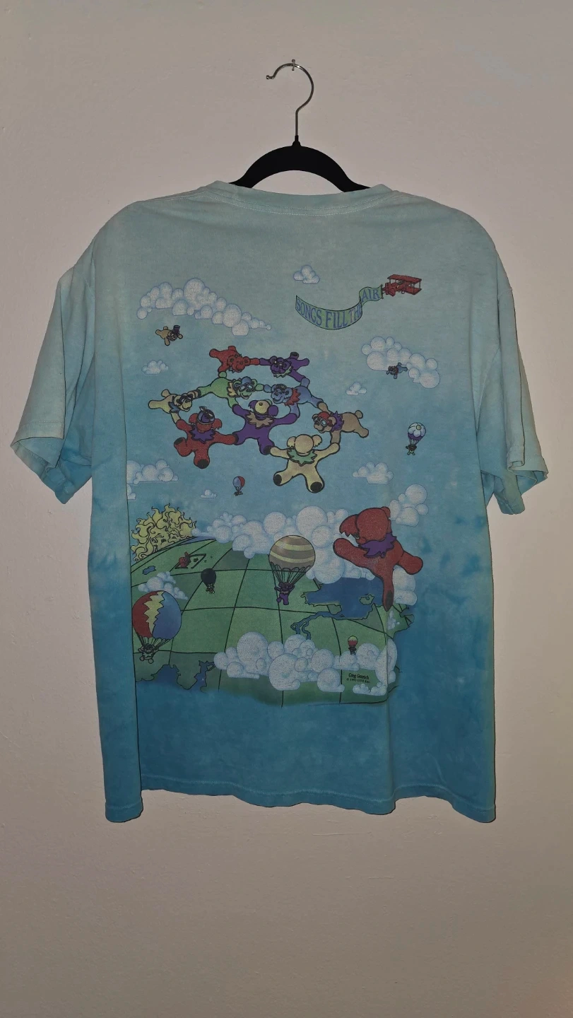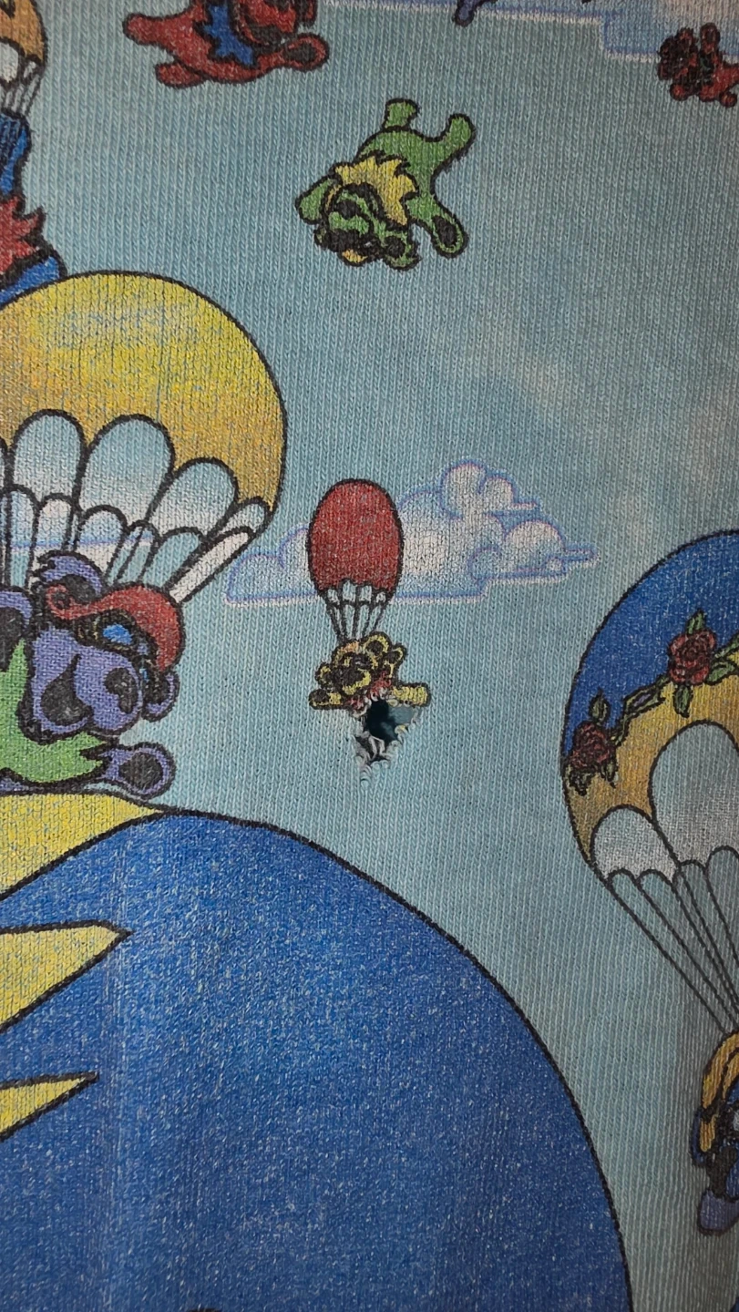 This Liquid Blue T-shirt from 2000 features a fun Grateful Dead dancing bears graphic with a skydiving theme. It's made of soft cotton. This shirt has a small hole near the collar. A hole in the middle of the torso area. Also a hole near the bottom hem. This shirt is 26 years old so some wear and tear is considered natural for a rare vintage find like this.
