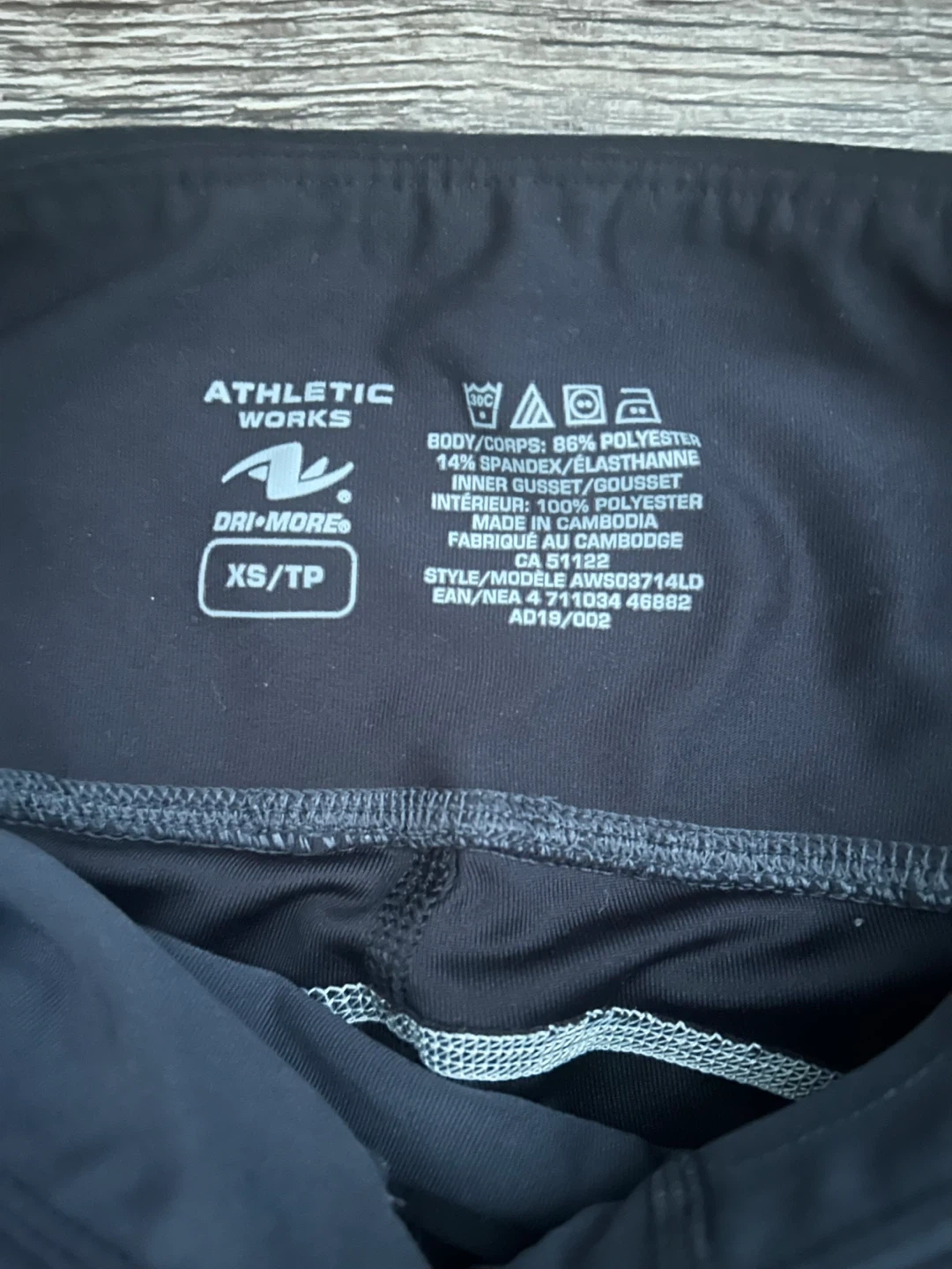 Athletic Works Dri-More leggings in black. Made of 86% polyester and 14% spandex/élasthanne. Inner gusset is 100% polyester. They're designed for comfort and performance. Perfect for workouts or everyday wear!