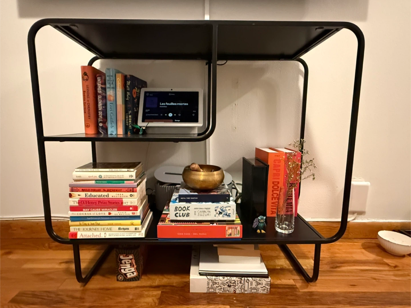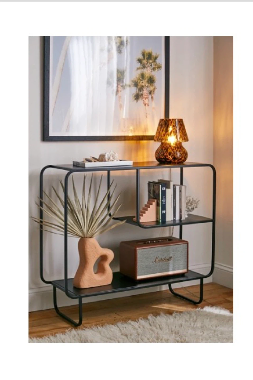 This stylish 2-tier shelf unit/storage console offers ample storage. It's constructed from durable black metal with a modern open design. Its compact size makes it a versatile addition to any room!