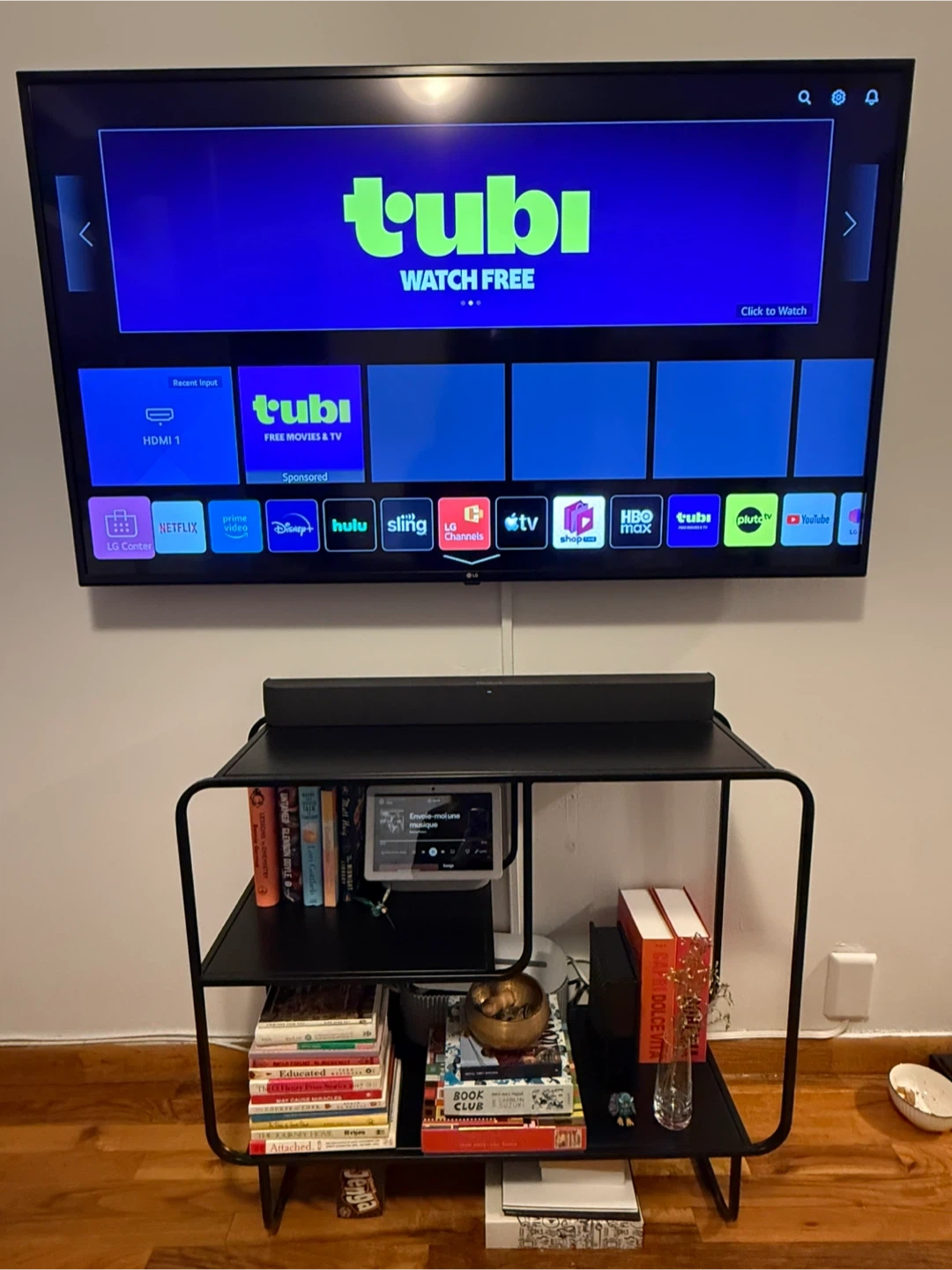 This stylish 2-tier shelf unit/storage console offers ample storage. It's constructed from durable black metal with a modern open design. Its compact size makes it a versatile addition to any room!