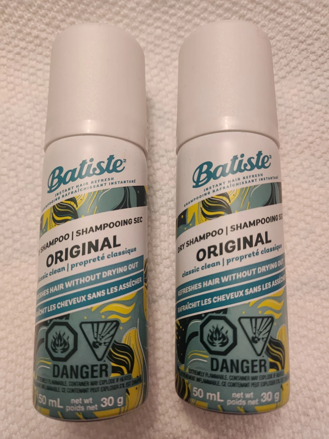 These are two cans of Batiste Original dry shampoo. Each can is 50mL and refreshes hair without drying it out. This classic clean formula is great for a quick refresh between washes.