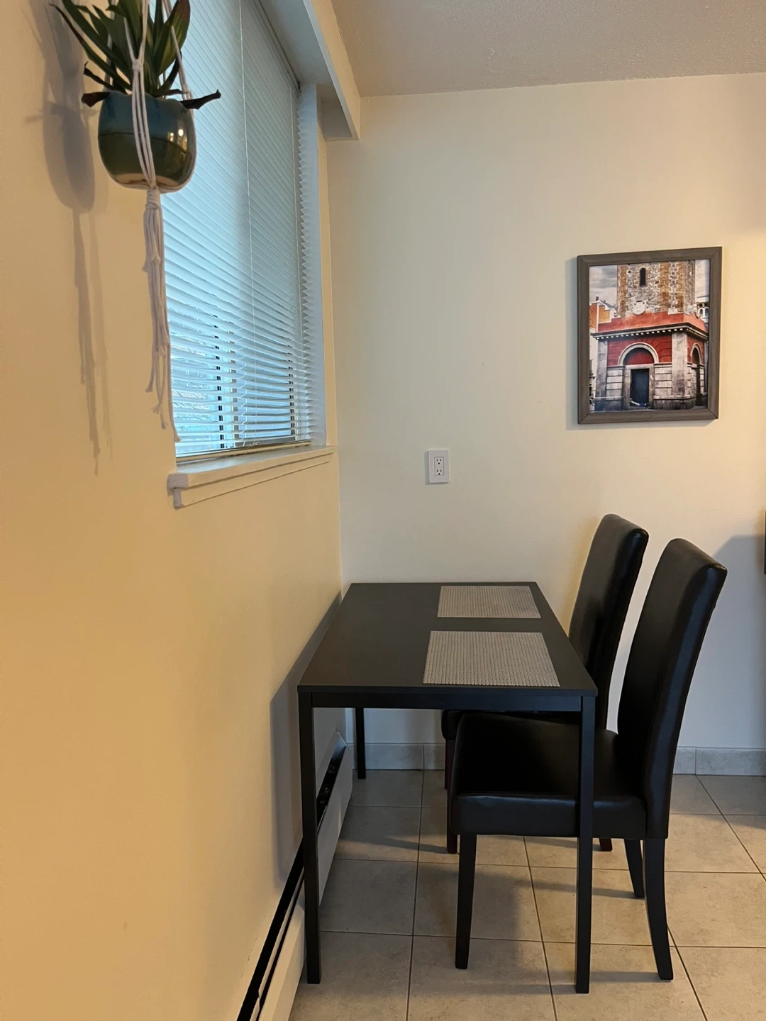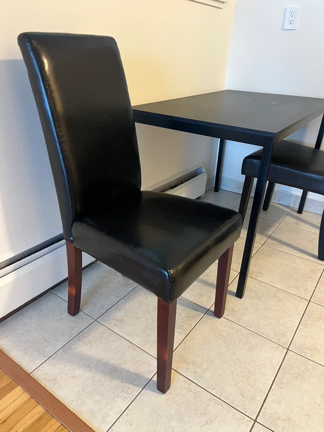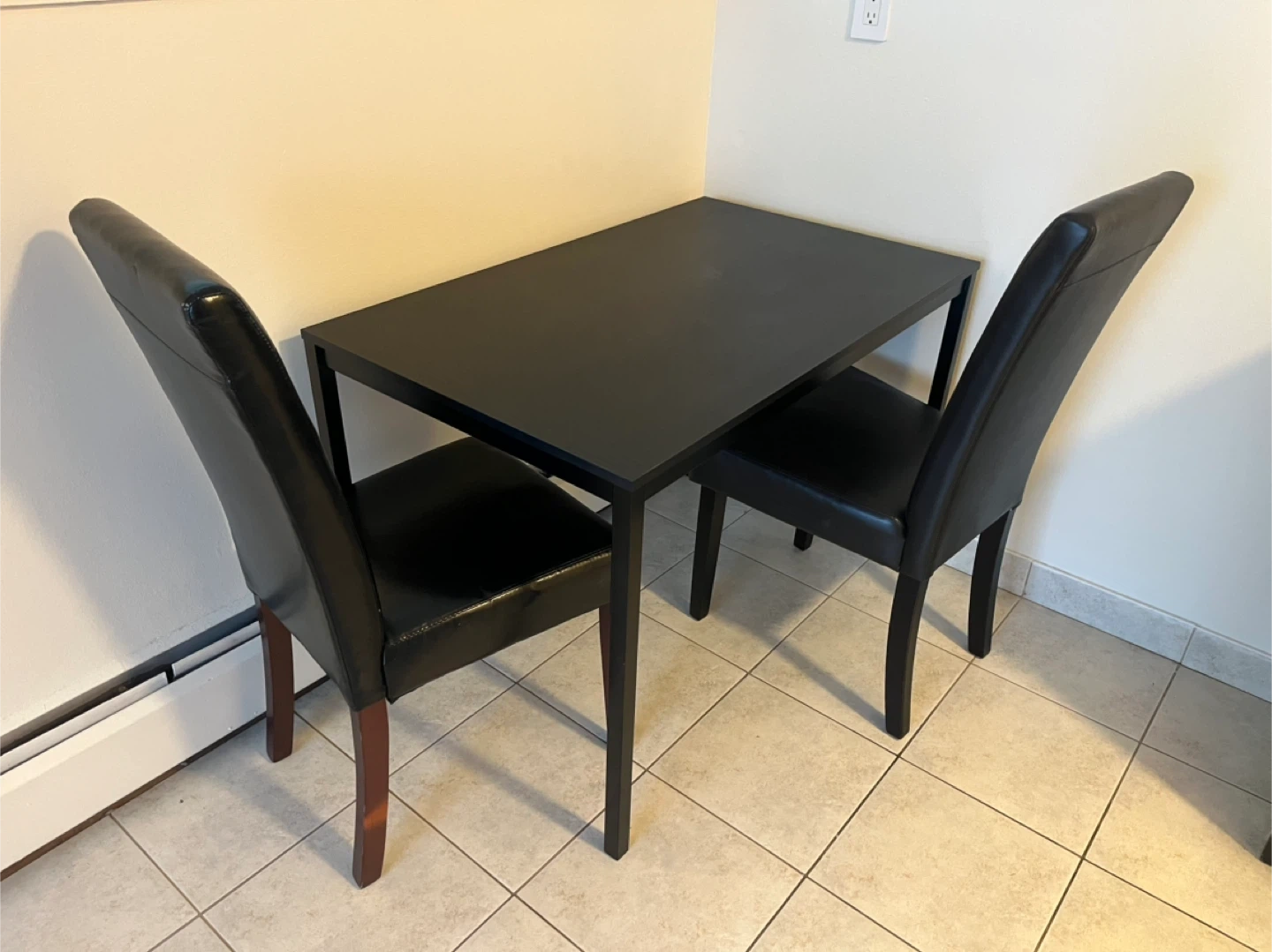 SET - Kitchen table with two comfy padded black dining chairs.