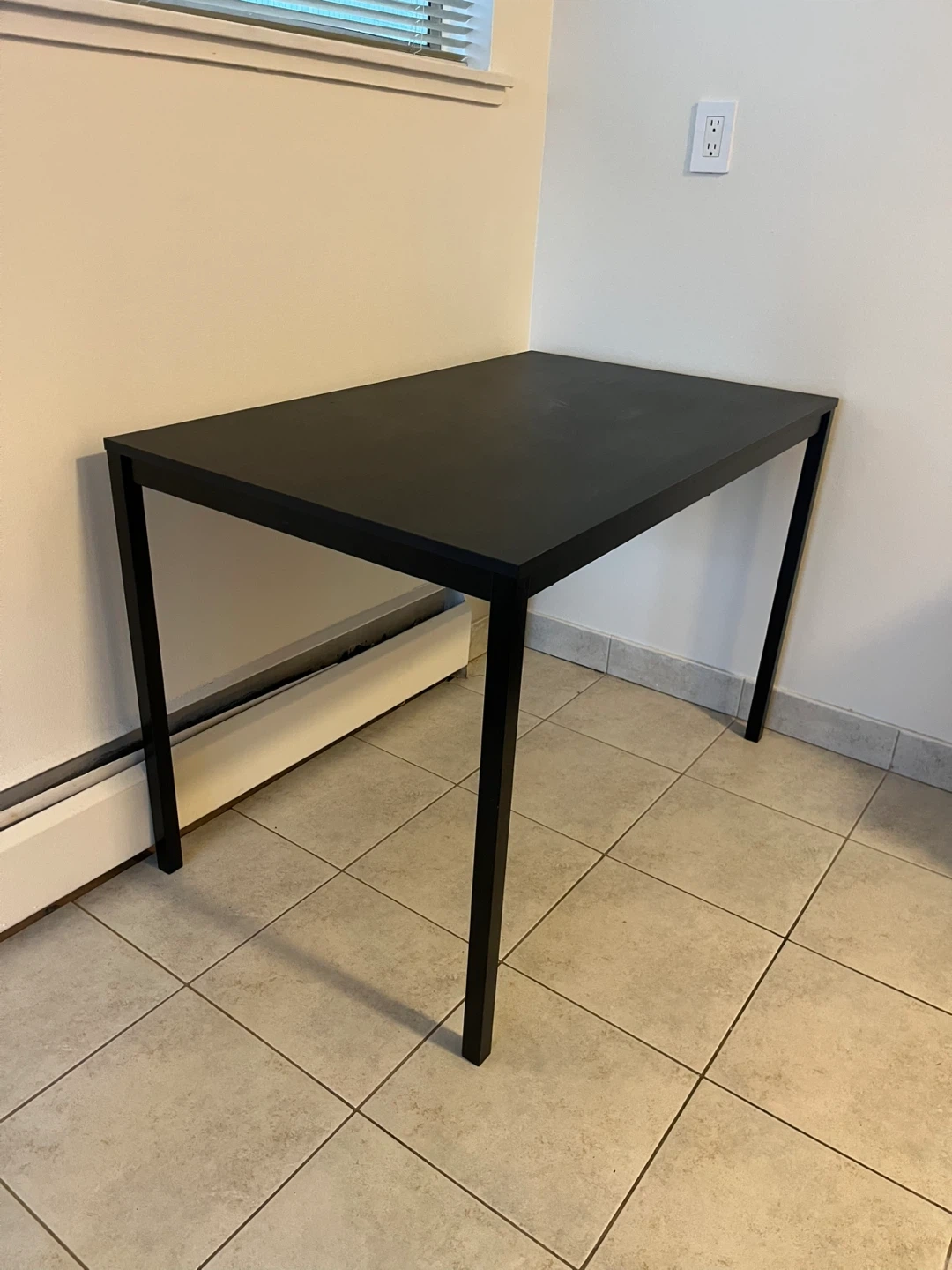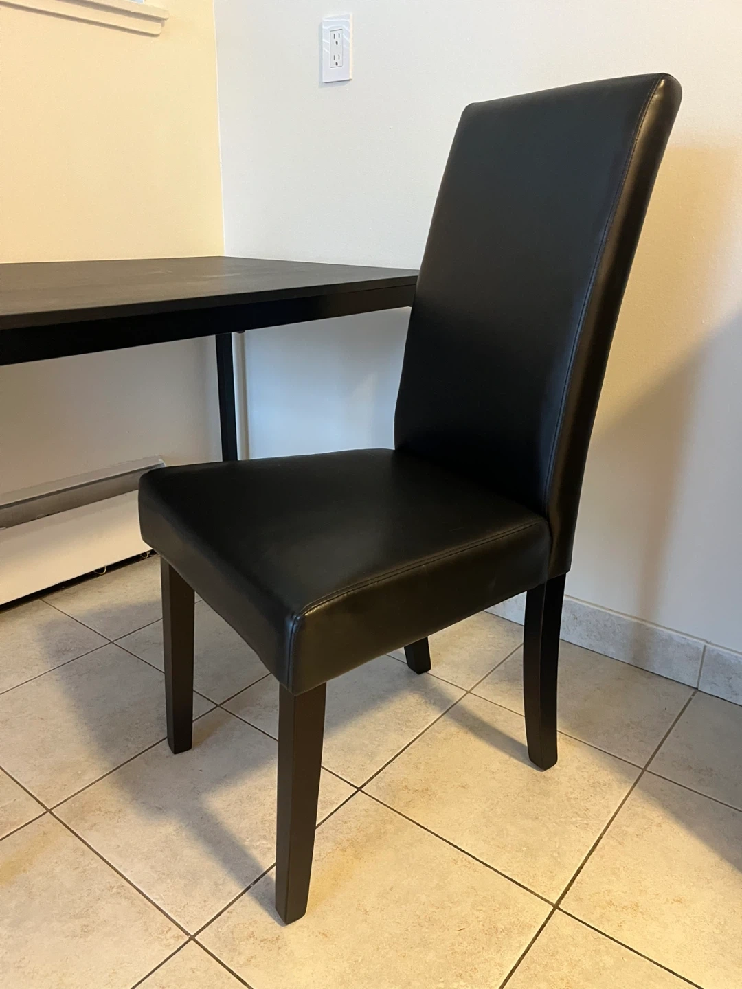 SET - Kitchen table with two comfy padded black dining chairs.
