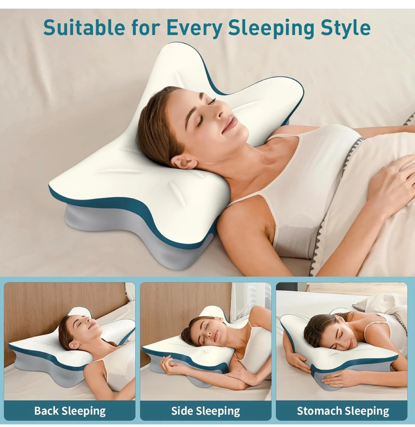 This cervical pillow is designed to support every sleeping style. It features an ergonomic butterfly shape to cradle your head and neck. The pillow's unique contouring helps maintain proper spinal alignment.