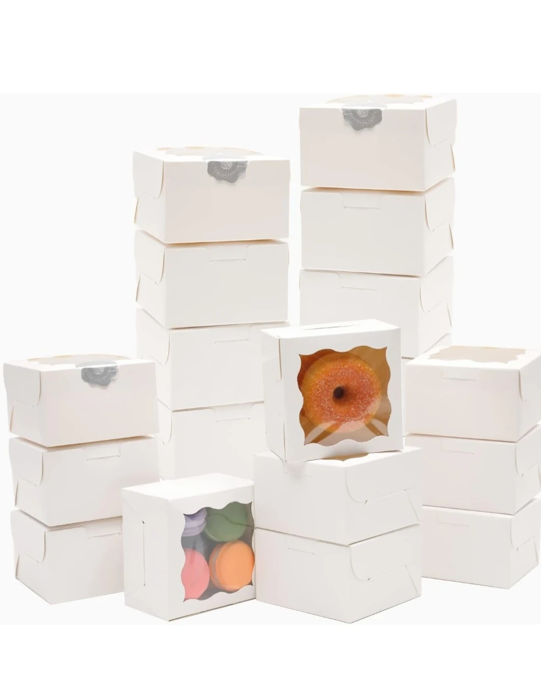 These white bakery boxes are perfect for packaging treats like donuts and macarons. They feature a clear window on the front to display your baked goods. Boxes are made of sturdy paperboard and come flat for easy storage. Size 4x4x2.5