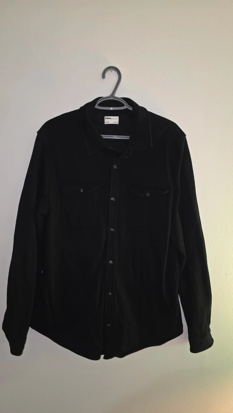 This Frank And Oak shirt jacket is a black button up long sleeve.