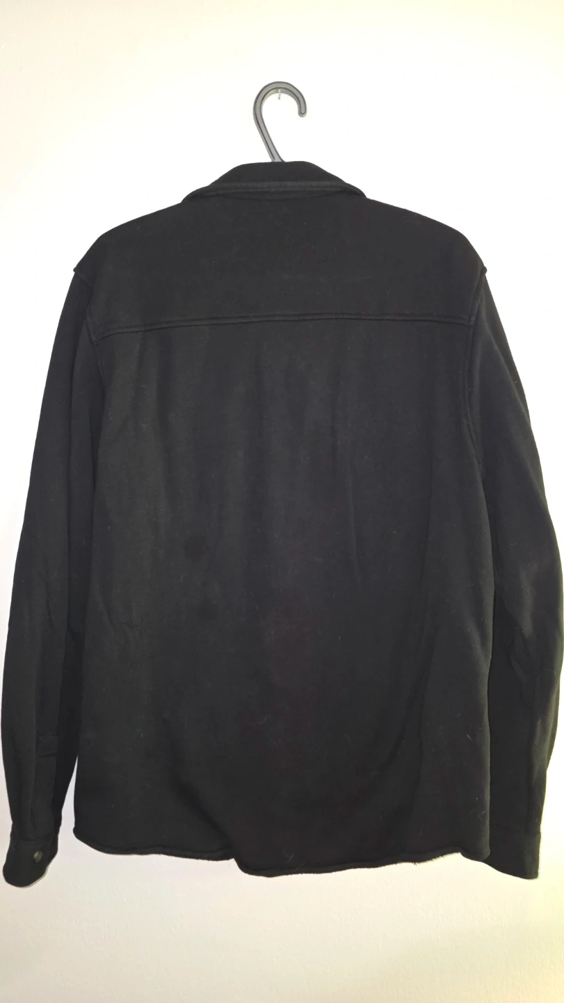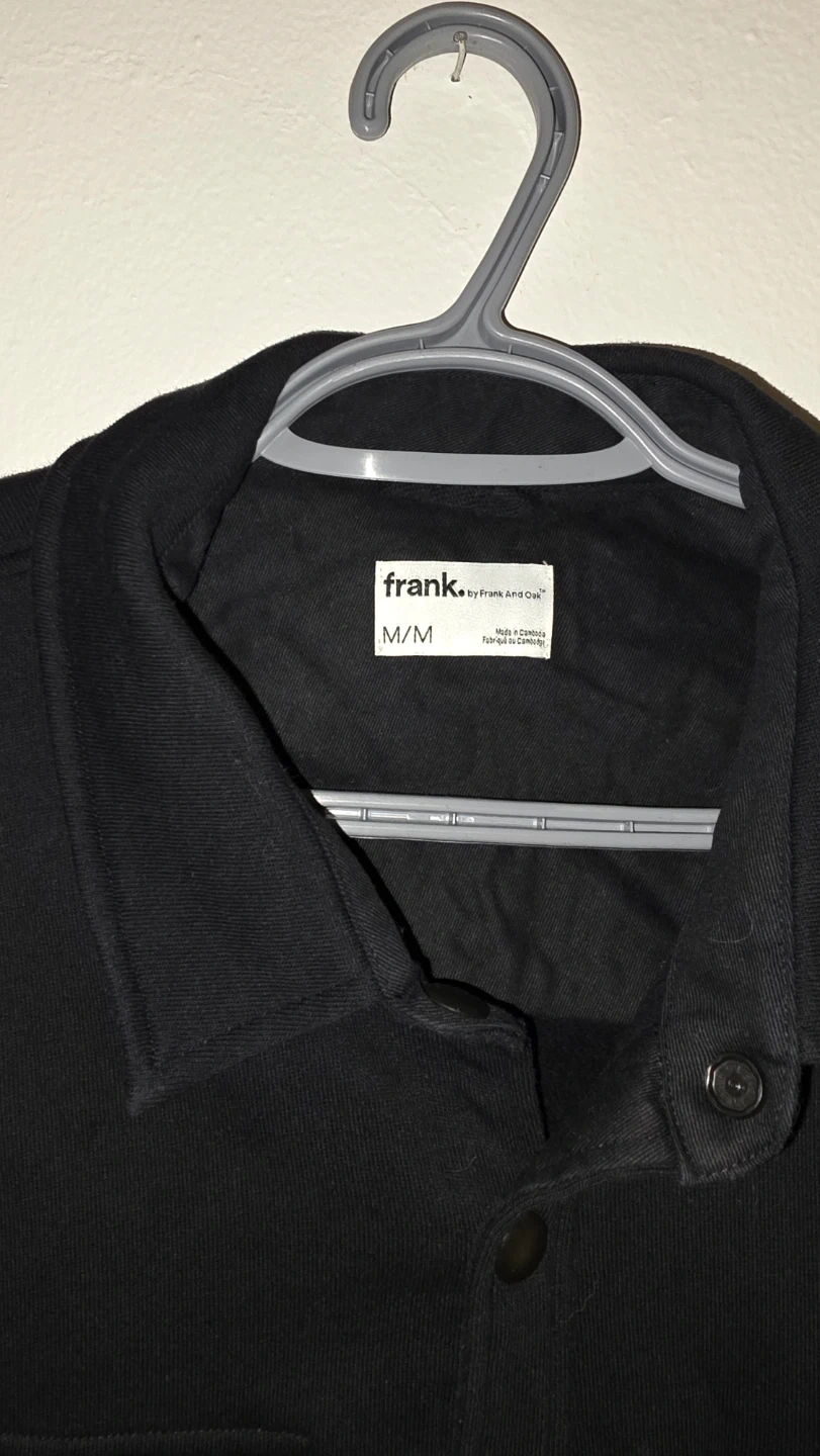 This Frank And Oak shirt jacket is a black button up long sleeve.