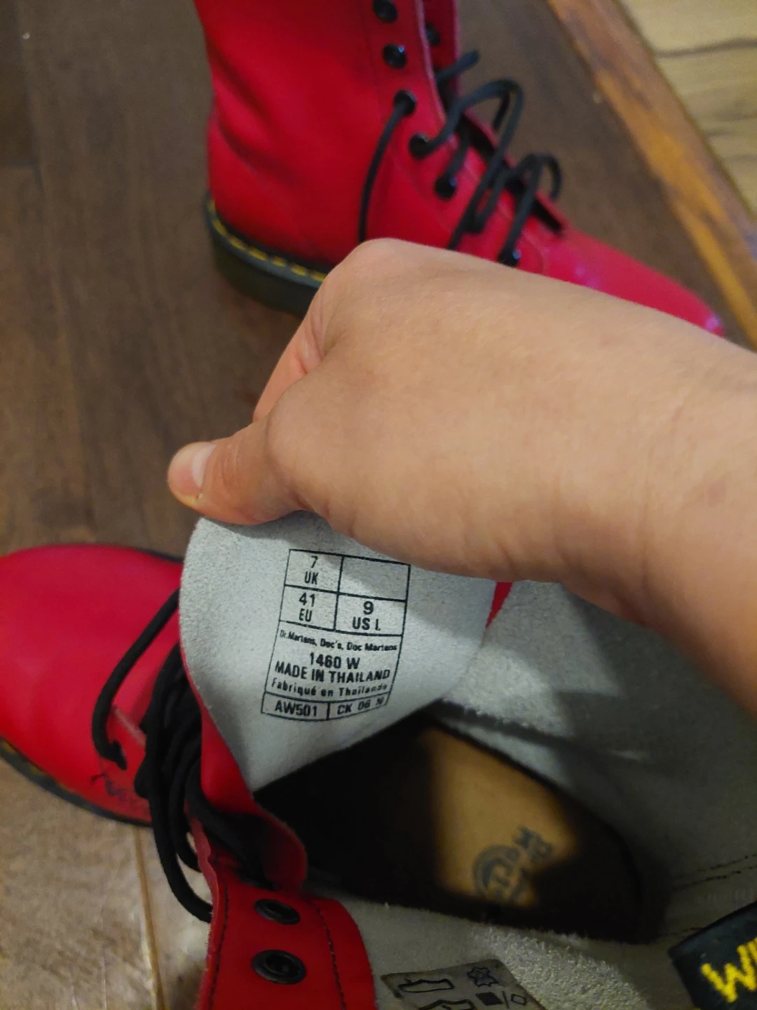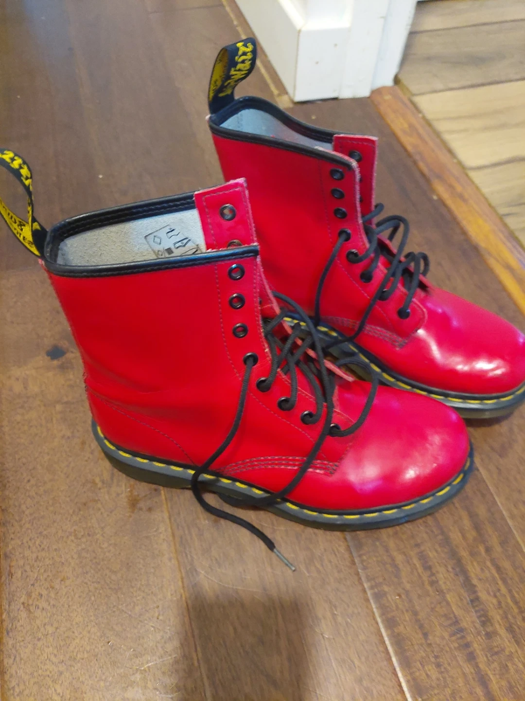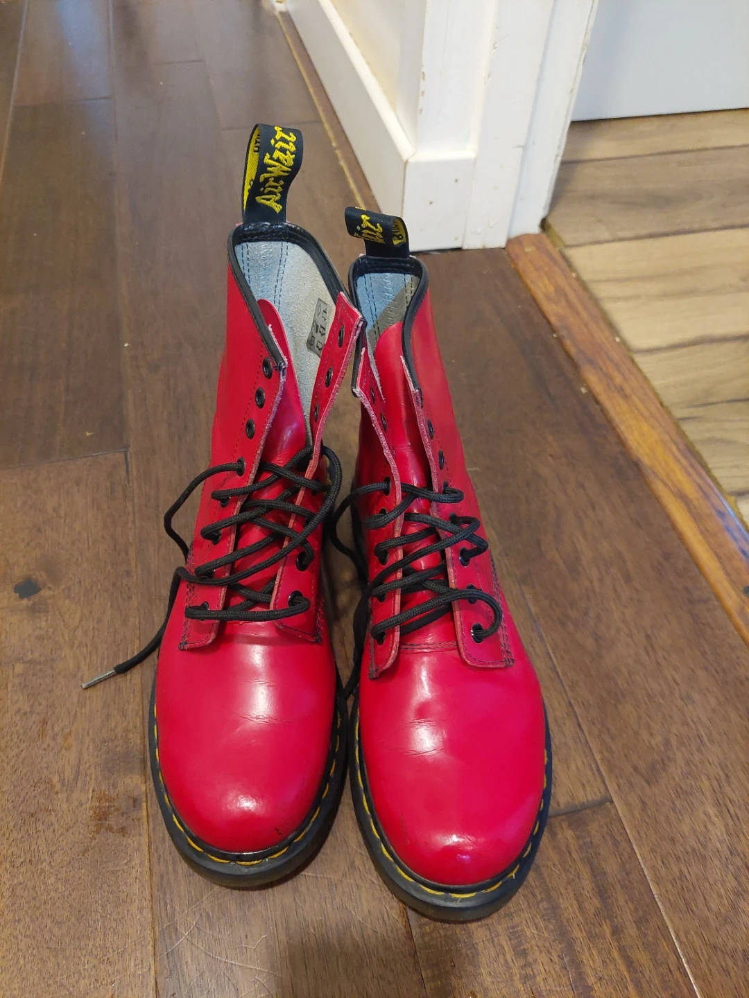 Iconic Dr. Martens 1460 W boots in a bright red patent leather. Size UK 7, EU 41, US L 9. They're a classic choice for everyday wear!