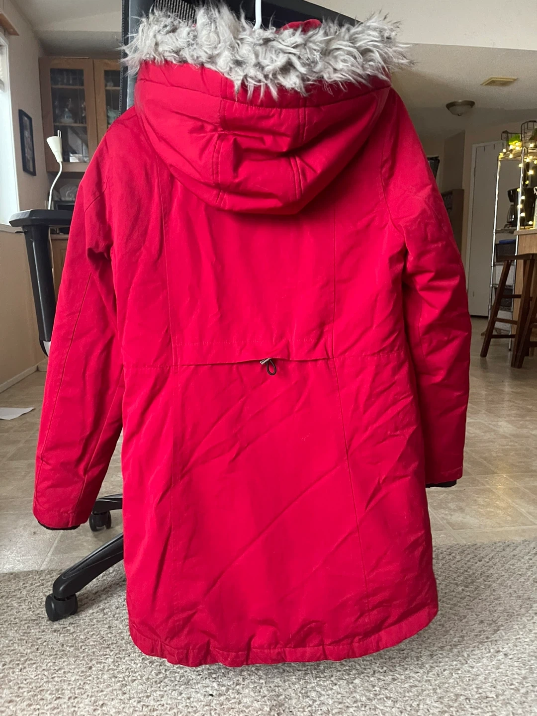 A warm, red parka-style coat designed for colder weather. It features a faux fur-lined hood and a button and zipper closure. Multiple pockets are included for convenience.