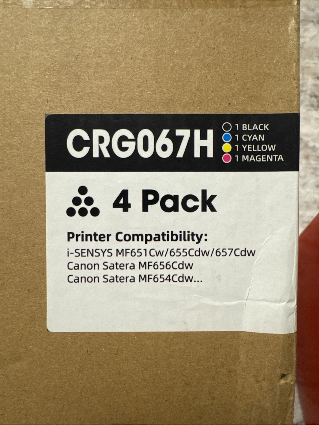 This is a 4 pack of Canon CRG067H toner cartridges. Includes 1 black, 1 cyan, 1 yellow, and 1 magenta cartridge. They're compatible with Canon i-SENSYS MF651Cw/655Cdw/657Cdw and Satera MF656Cdw/MF654Cdw printers. These are brand new, sealed cartridges.