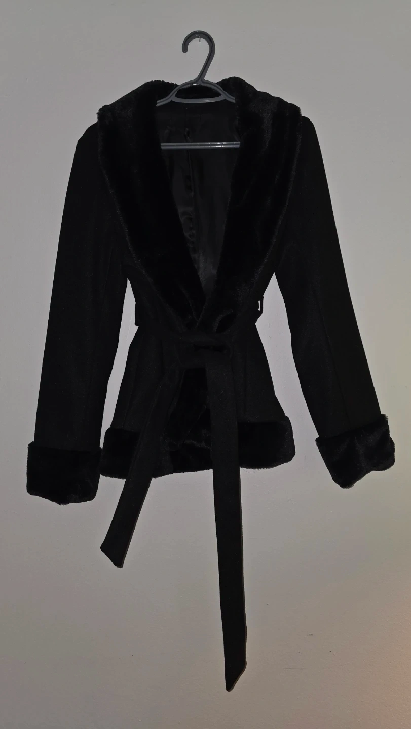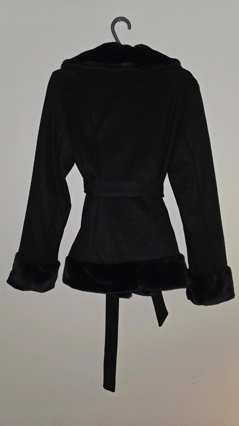 A black jacket with faux fur trim on the collar, cuffs, and hem. It has belted waist and a smooth interior lining. Barely used, still like new.