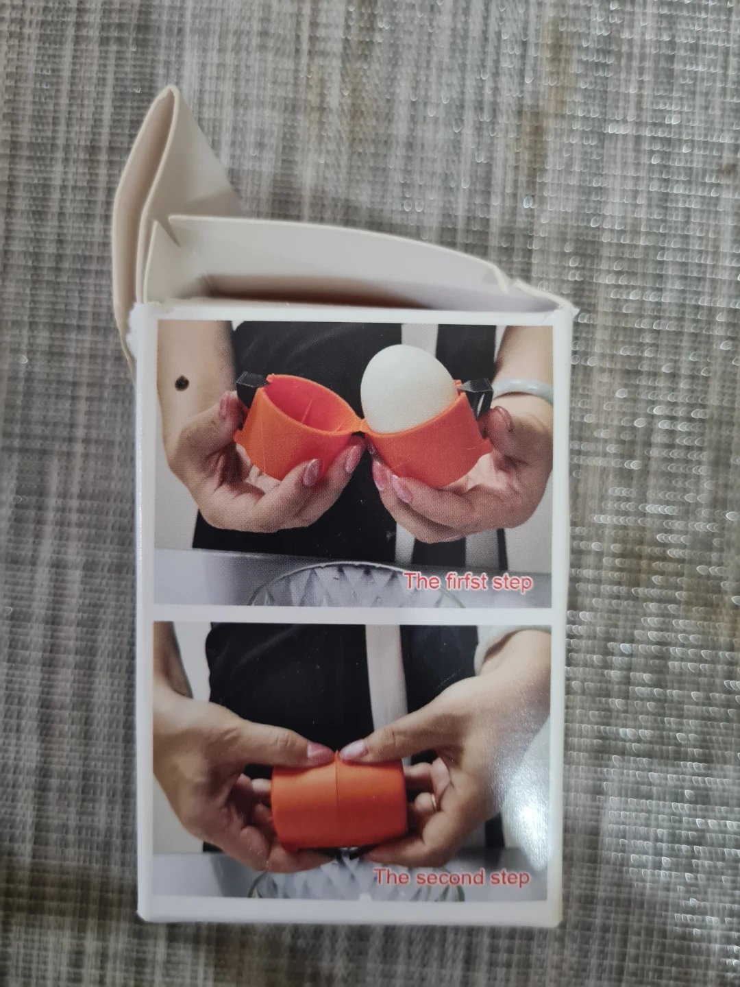 This simple egg opener is designed to easily crack eggs. It's orange and made of plastic. This gadget helps you open eggs without making a mess!