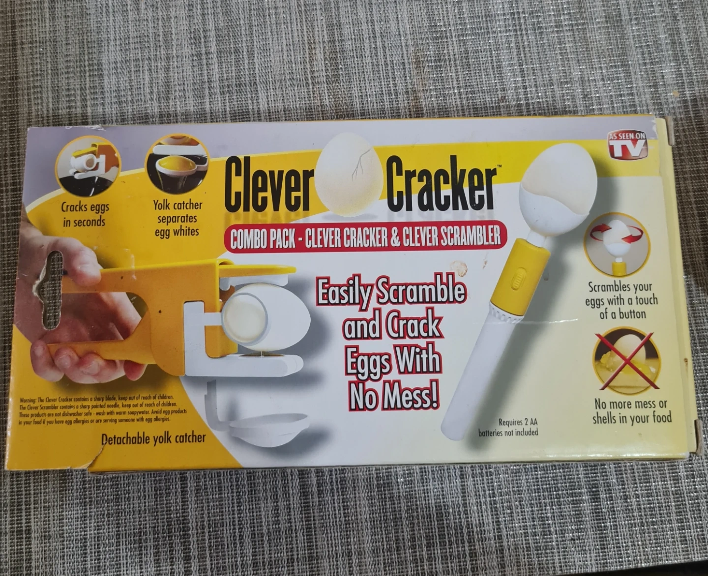 Easily scramble and crack eggs with no mess! This combo pack includes the Clever Cracker and Clever Scrambler. It's designed to scramble your eggs with a touch of a button and crack them easily. The detachable yolk catcher separates egg whites.