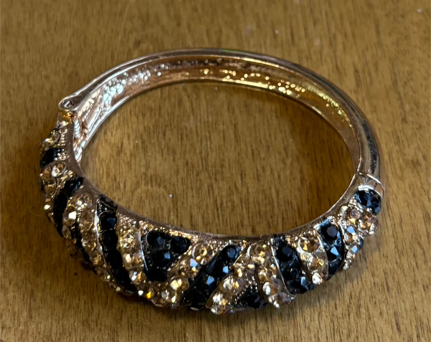 This bangle bracelet features a bold black and gold striped design with sparkling rhinestones. It's a hinged style for easy wear. The metal appears to be gold-toned.