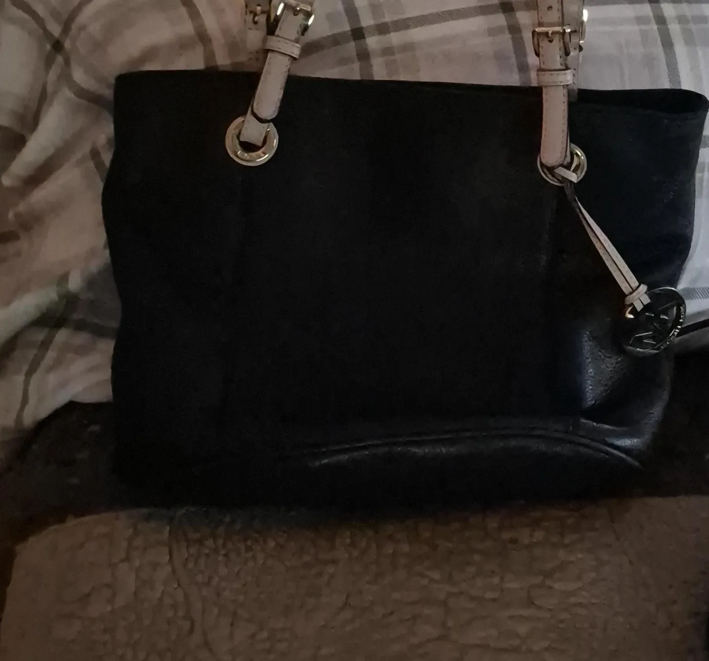 This is a Michael Kors black leather tote bag. It's a classic design with light-coloured straps and silver hardware. This tote is perfect for everyday use!