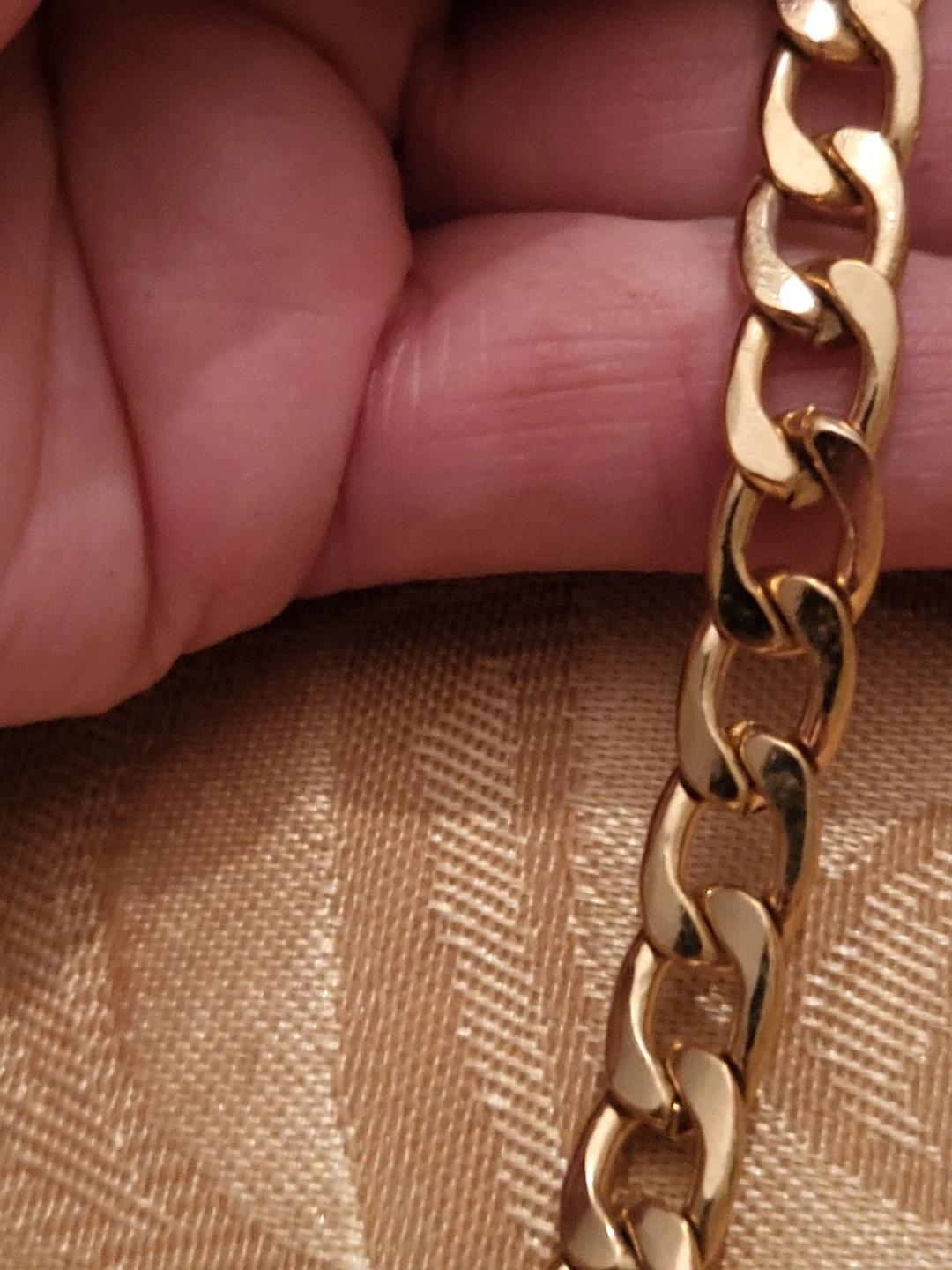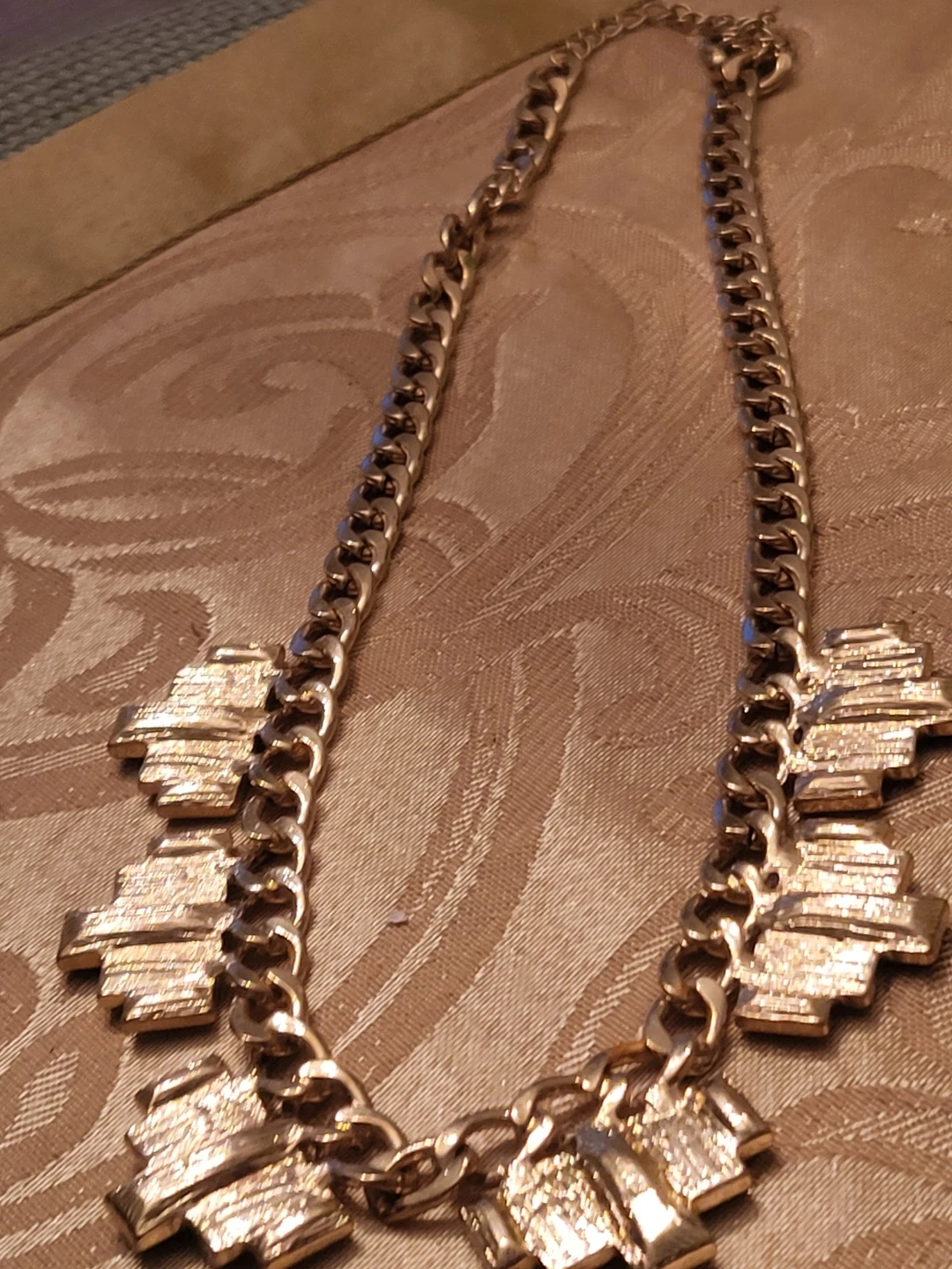 This gold tone necklace features a chunky curb chain with geometric pendant accents. The pendants have a mix of black, grey, and white inlay. It's secured with a lobster clasp.