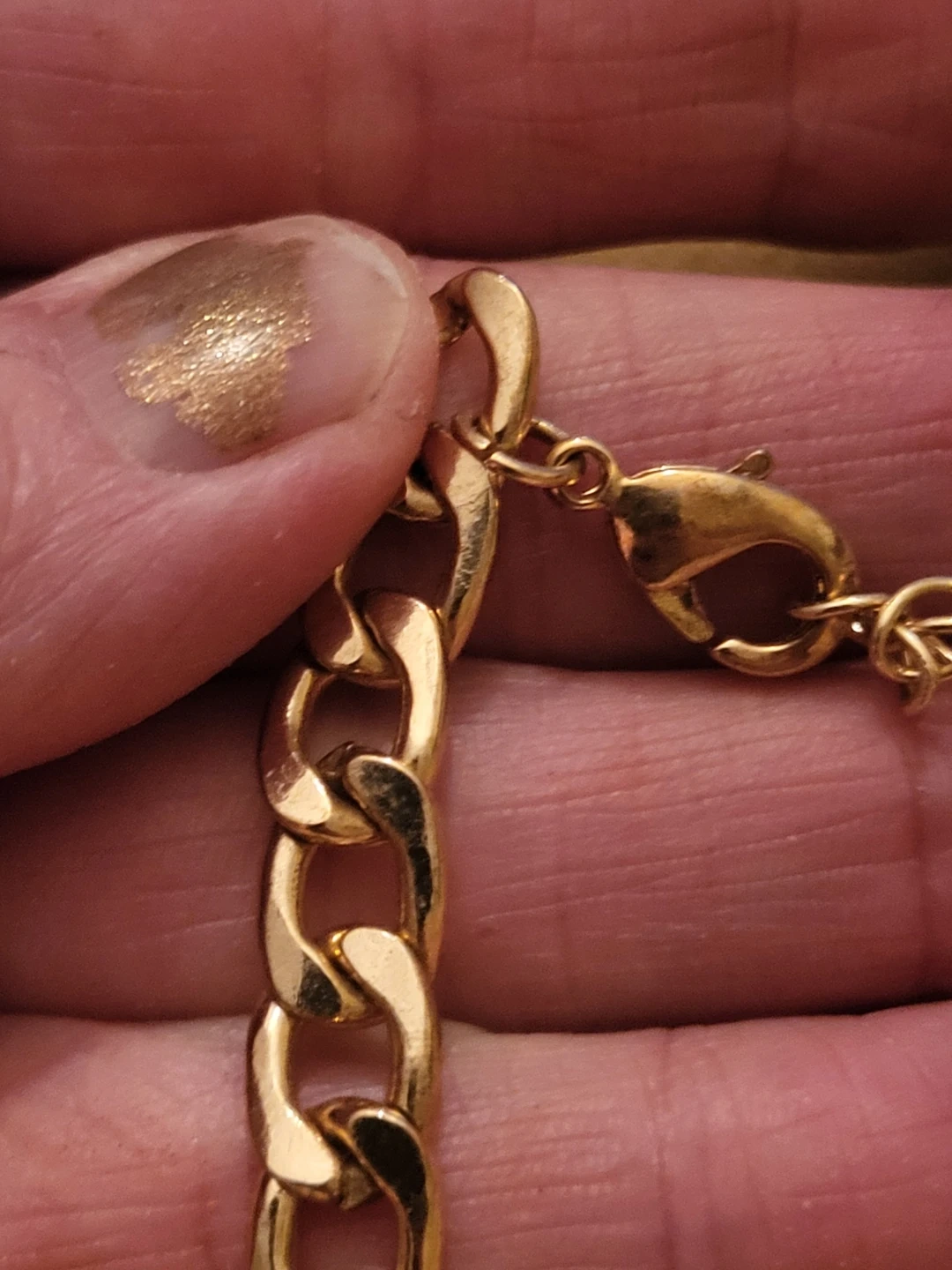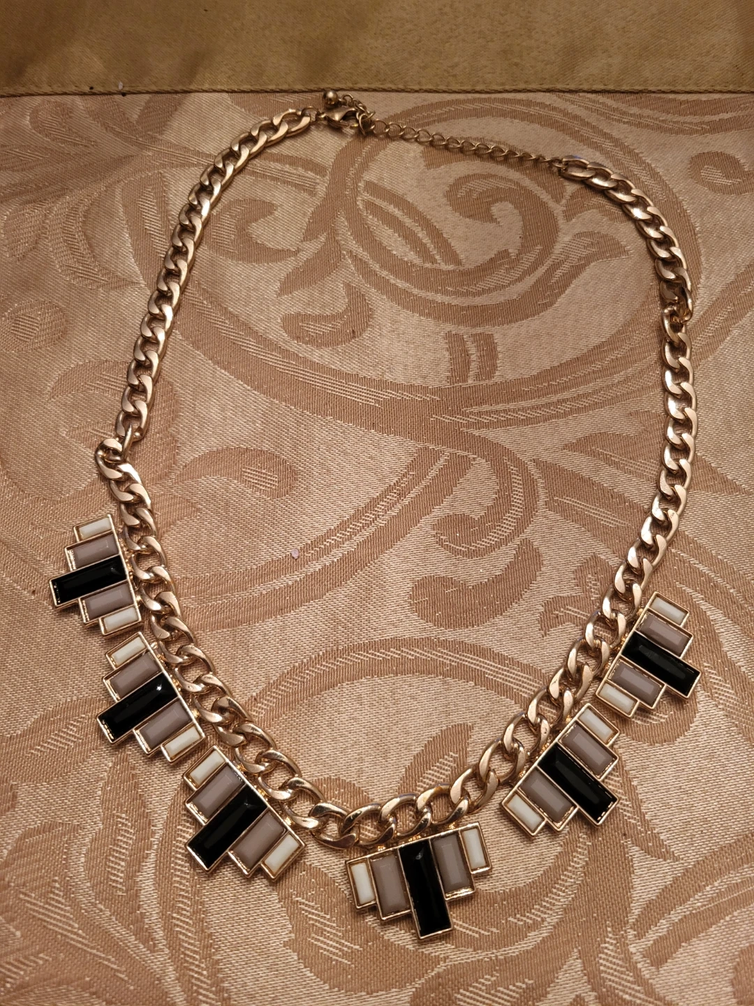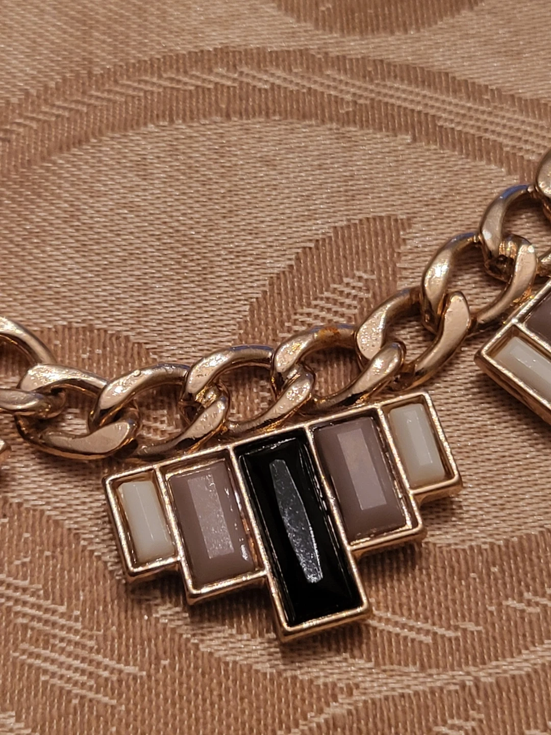 This gold tone necklace features a chunky curb chain with geometric pendant accents. The pendants have a mix of black, grey, and white inlay. It's secured with a lobster clasp.