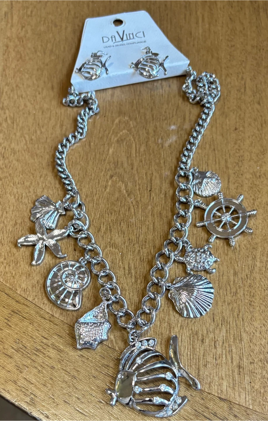 This is a charming necklace and earring set from Da Vinci. It features multiple nautical-themed charms like seashells, a starfish, a ship's wheel, and a fish. The set is silver-toned and includes matching fish-shaped earrings.