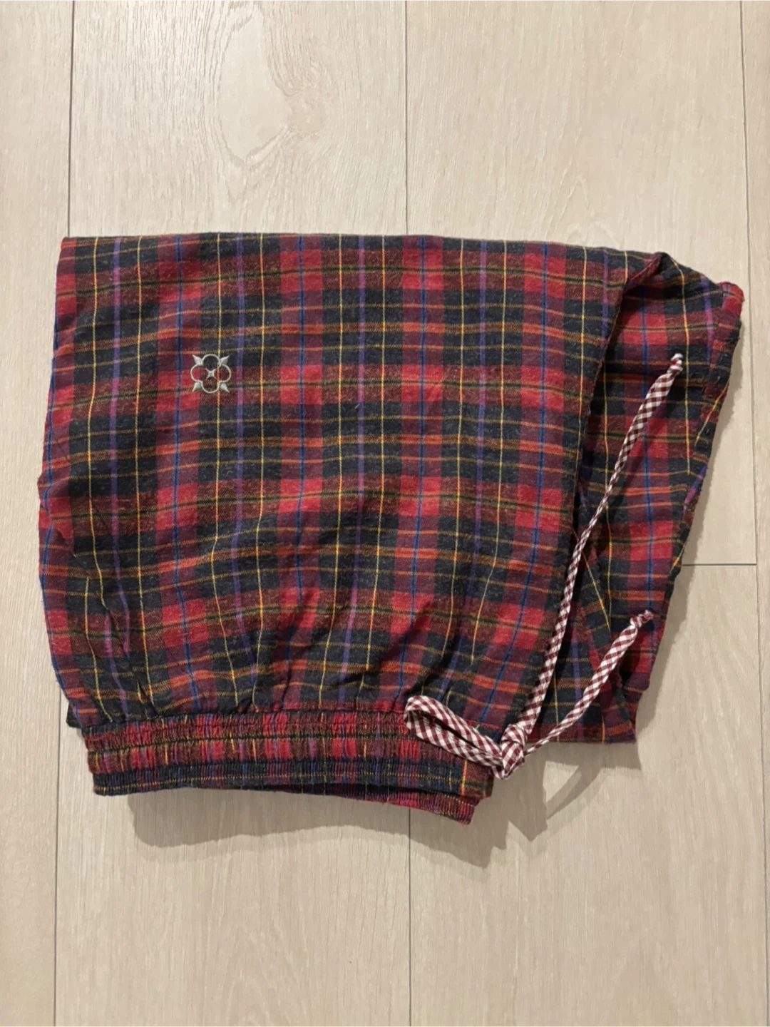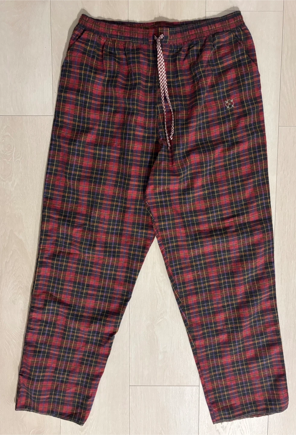 Comfortable plaid lounge pants in a classic red and navy check pattern.