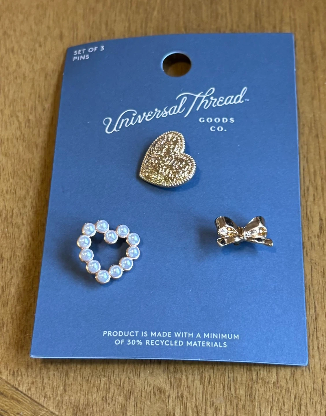 This set includes three decorative pins. It features a textured gold heart pin, a heart-shaped pin with iridescent faux pearls, and a small gold bow pin.