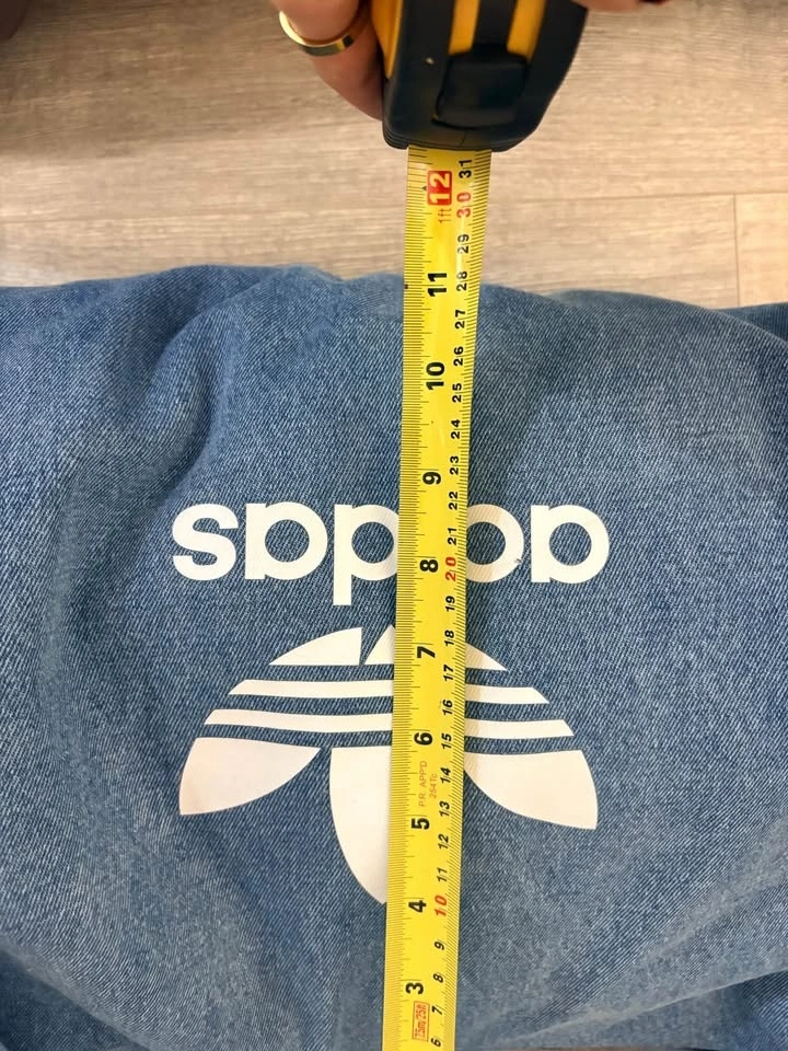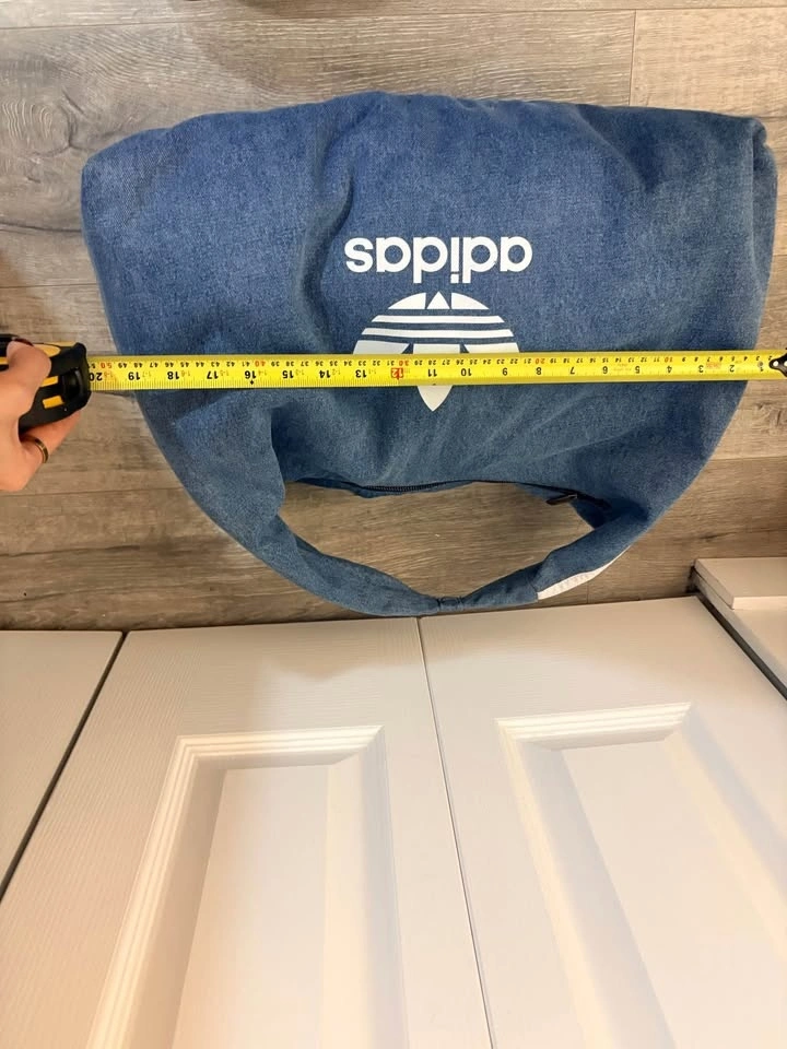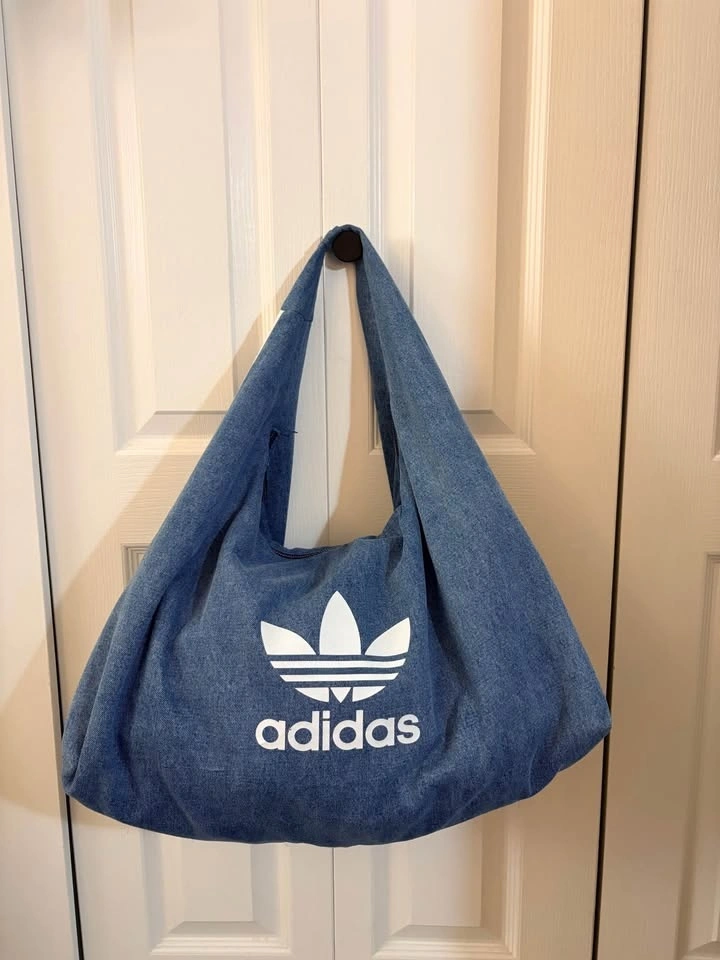 Spacious Adidas hobo shoulder bag made from a cool denim-like fabric in blue. Features a large white trefoil logo on the front. Includes a matching detachable pouch, also with a trefoil logo. Comfortable strap.
