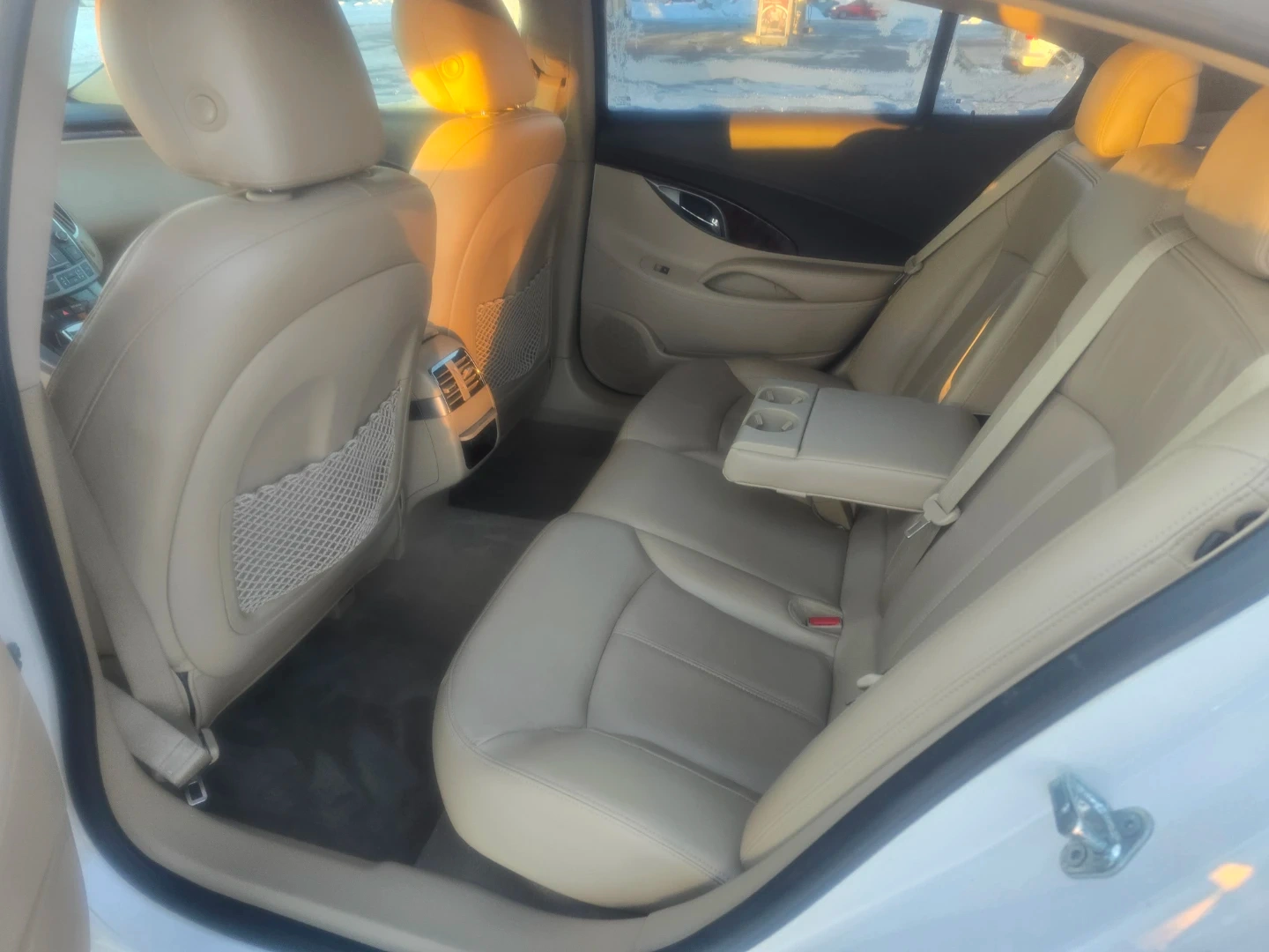 This is a white Buick LaCrosse sedan with leather interior. It features a comfortable ride and spacious cabin. Great for daily commutes or family trips!