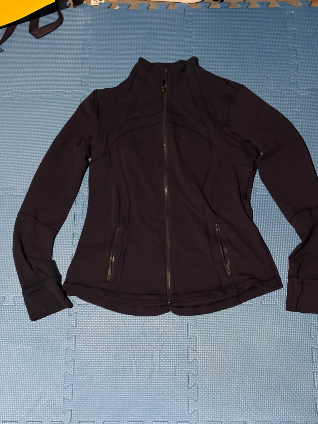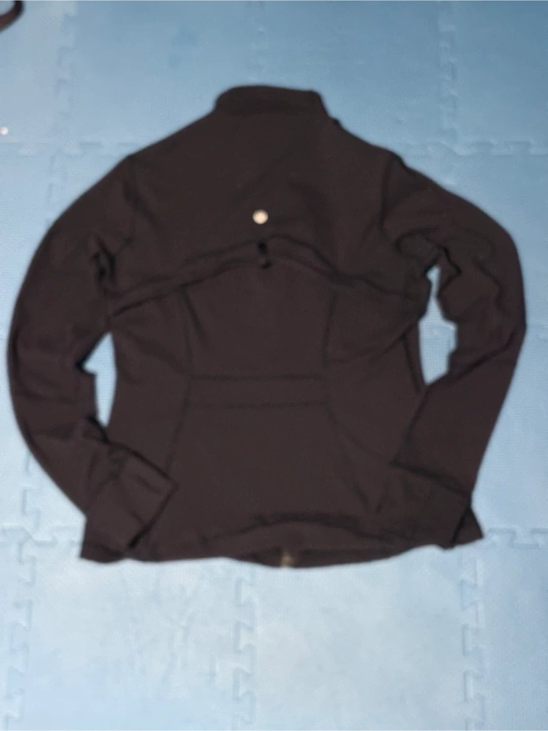 This is a black Lululemon full zip jacket. It's made from a comfortable, stretchy material. It has zippered pockets and thumbholes at the cuffs.