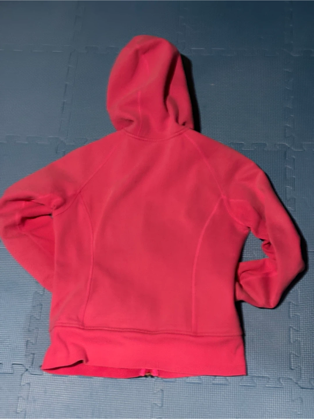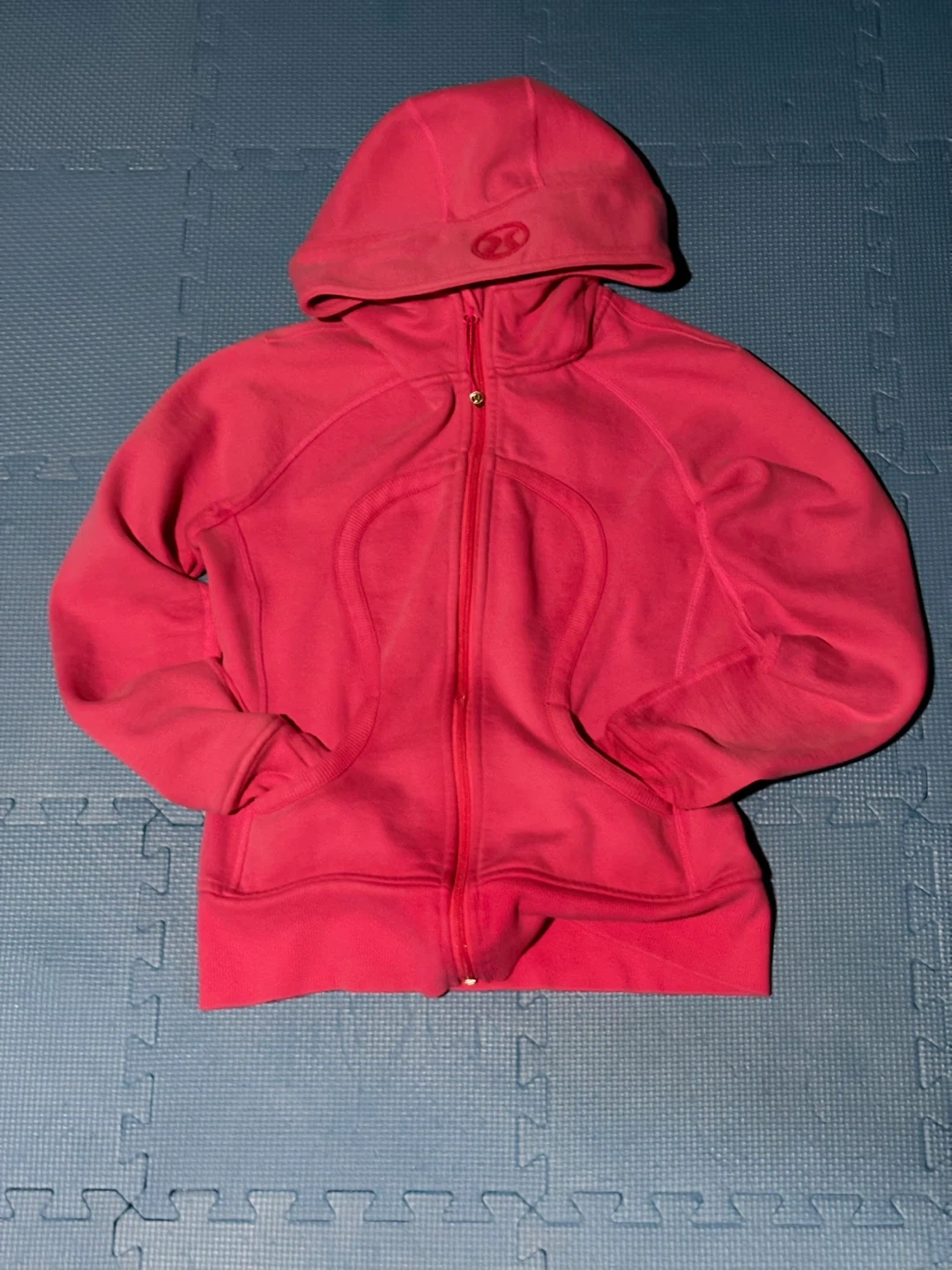 This is a bright pink Lululemon zip-up hoodie. It's made from a soft material and features a full zipper closure and a hood. It's perfect for casual wear or light athletic activities.