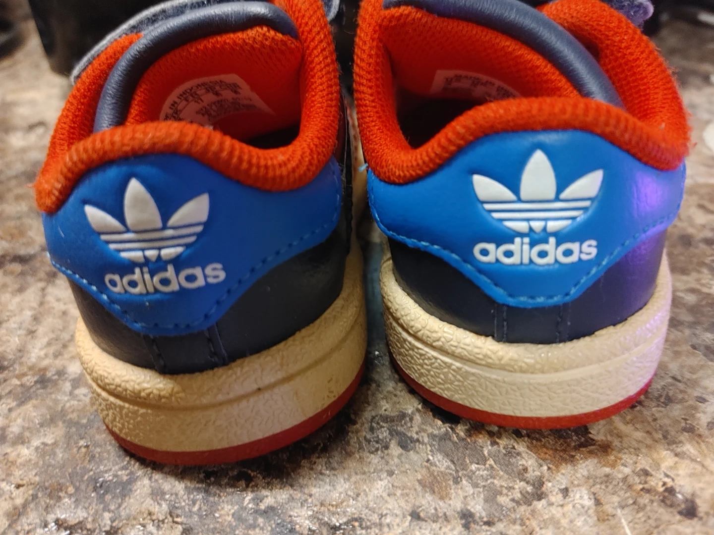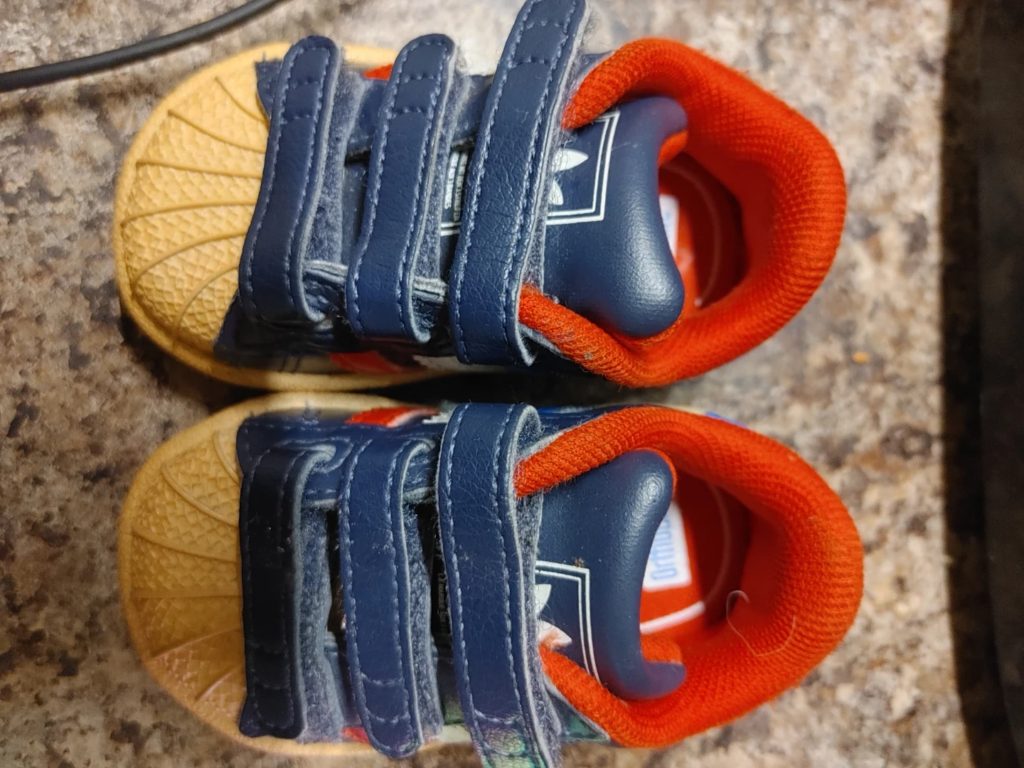 Adidas Superstar crib shoes in toddler size 2K. These navy blue and red shoes feature the classic three stripes and hook-and-loop closures. Made in Indonesia.