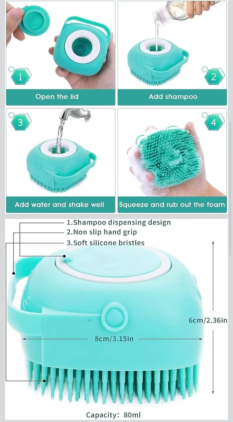 This silicone bath brush has a shampoo dispensing design. It's made for whole body use with soft silicone bristles. Ideal for giving your pet a comfortable massage during bath time!