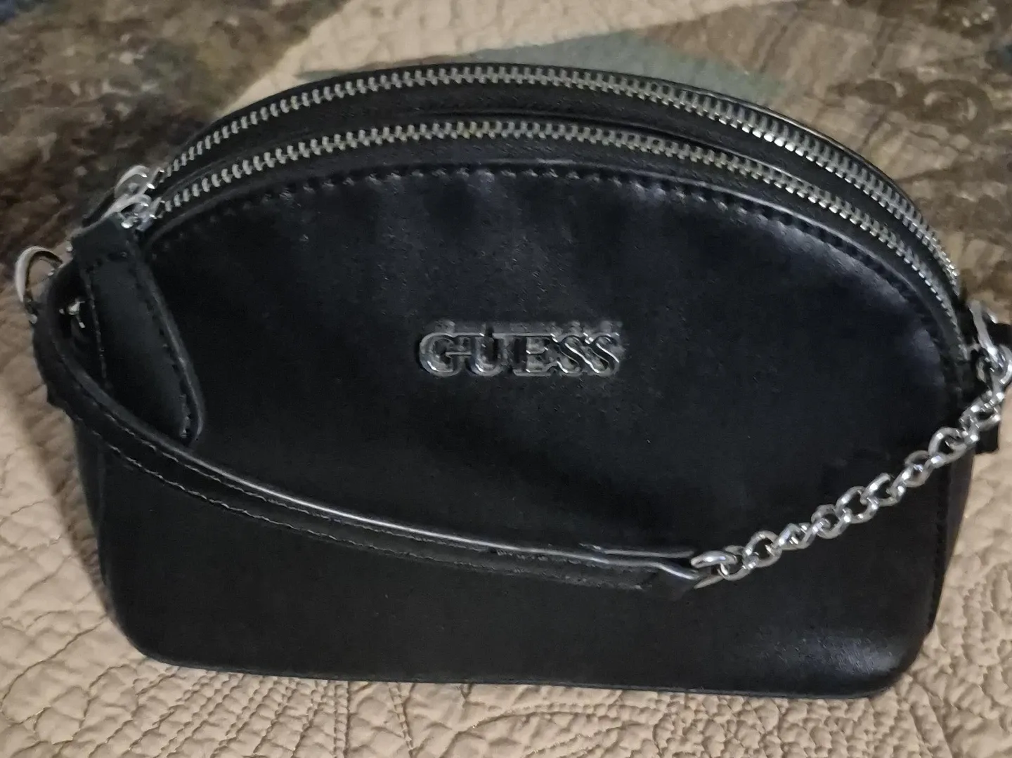 This black Guess crossbody bag is made of faux leather. It has two top zippered compartments and a silver chain strap detail. A small, stylish bag perfect for essentials!